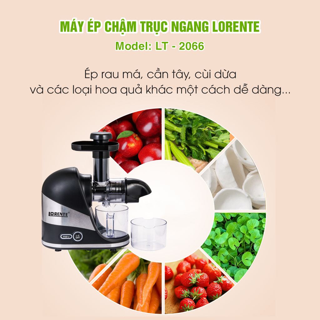 Máy ép chậm Lorente LT-2066 là dòng máy ép hàng đầu chuyên ép các loại rau củ như rau má, cần tây, cùi dừa, ổi, cà rốt và các loại củ quả khác.