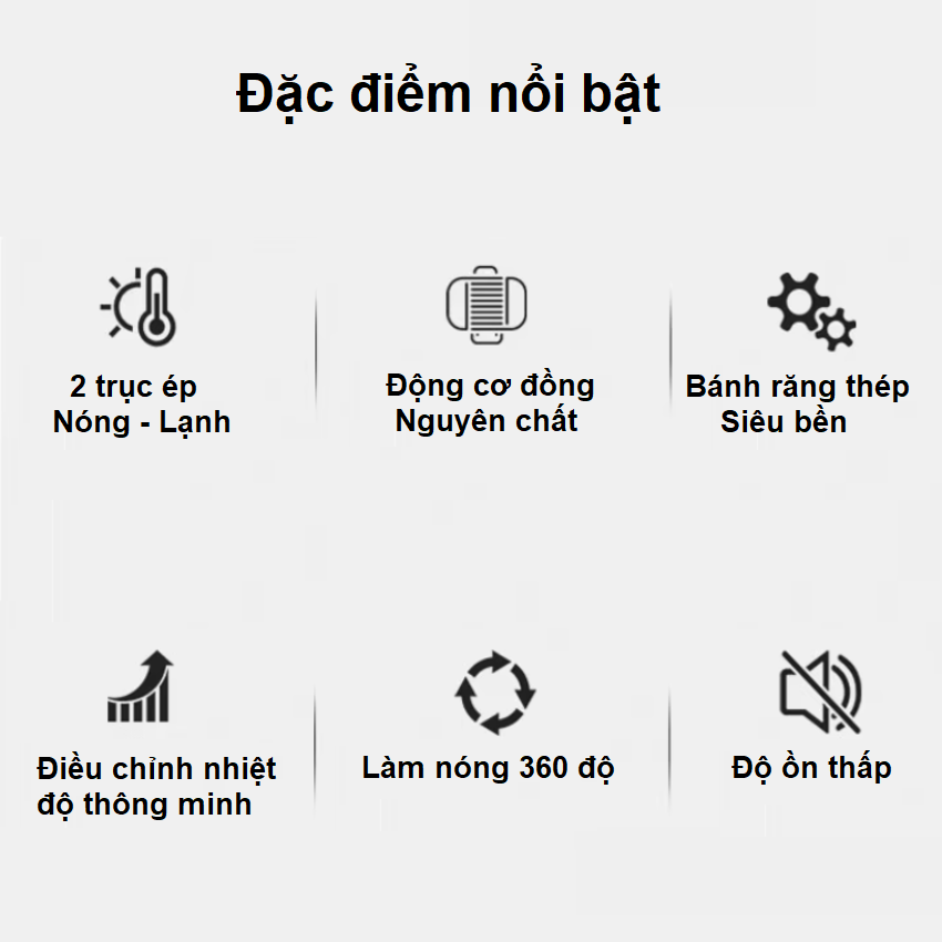 - Sản phẩm sử dụng động cơ không chổi than, tăng độ bền gấp 3 lần so với các loại thường khác có dùng chổi than. - Máy có thể sử dụng 2 chế độ ép NÓNG và LẠNH
