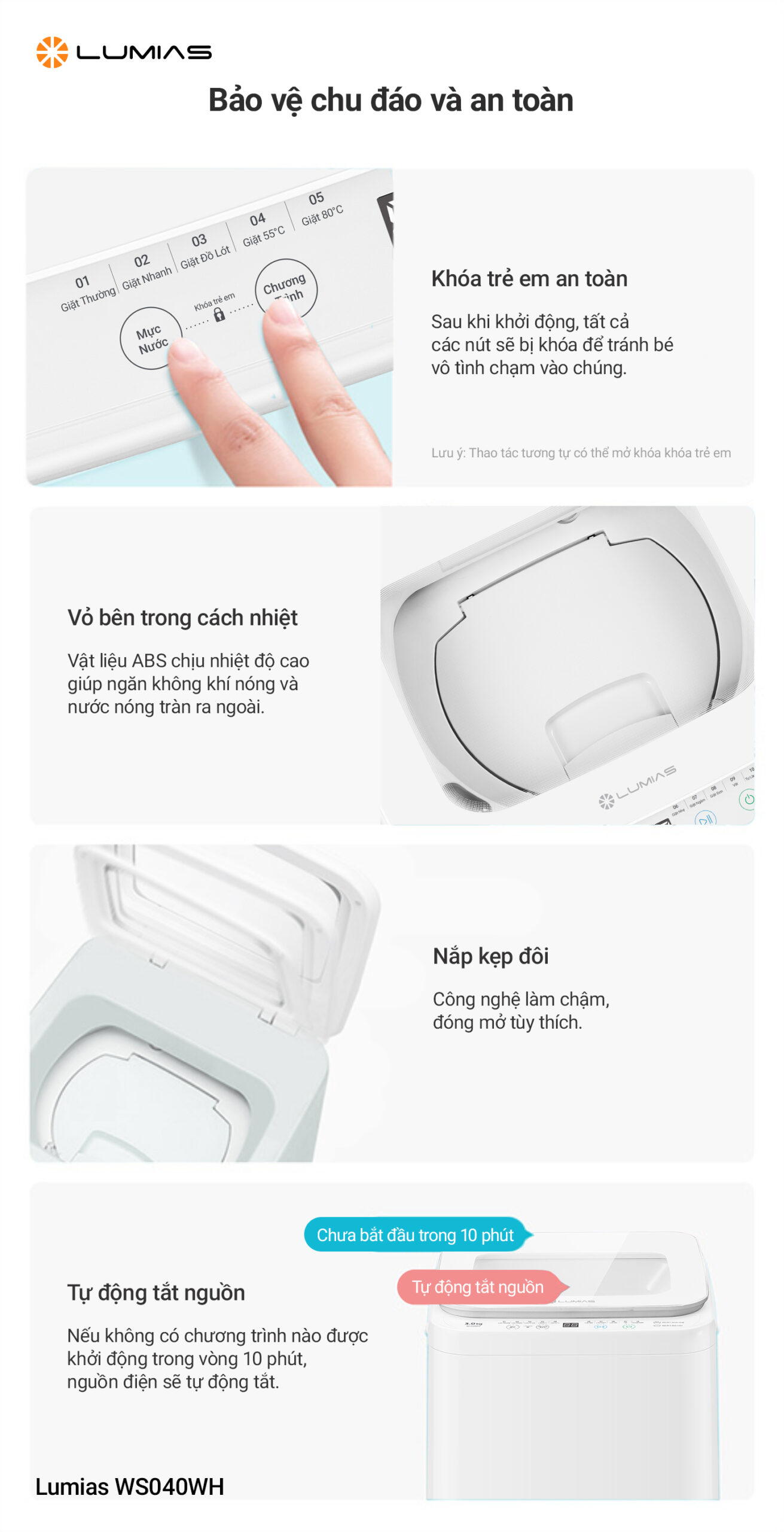 Tên sản phẩm Máy giặt mini chức năng giặt nhiệt độ cao Lumias WS040WH Model WS040WH Công suất giặt 220W Công suất giặt khi làm nóng nước 1500W Điện áp/Tần số 220V/50Hz Chất liệu Lồng