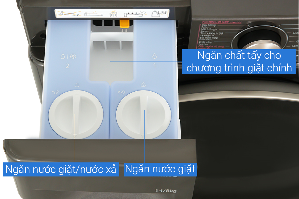- Khối lượng giặt 14 kg đi kèm khối lượng sấy 8 kg, phù hợp với nhu cầu giặt cho gia đình trên 7 người hoặc ít thành viên hơn nhưng có nhu cầu giặt giũ cao.