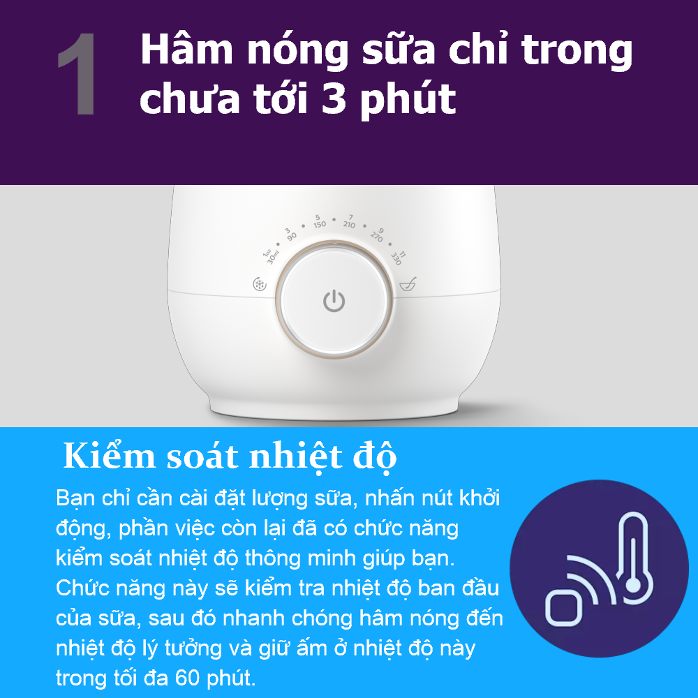 • Kiểm soát nhiệt độ: Chức năng kiểm soát nhiệt độ thông minh giúp phòng tránh việc sữa và thức ăn cho bé bị hâm nóng quá mức cho phép, đồng thời tự động điều chỉnh chế độ cấp nhiệt để hâm nóng nhanh và đều ở nhiệt độ lý tưởng cho bé. Sữa và thức ăn cho bé được hâm nóng đều, đảm bảo không có những điểm nóng gây bỏng cho trẻ, và làm mất đi một số vitamin.