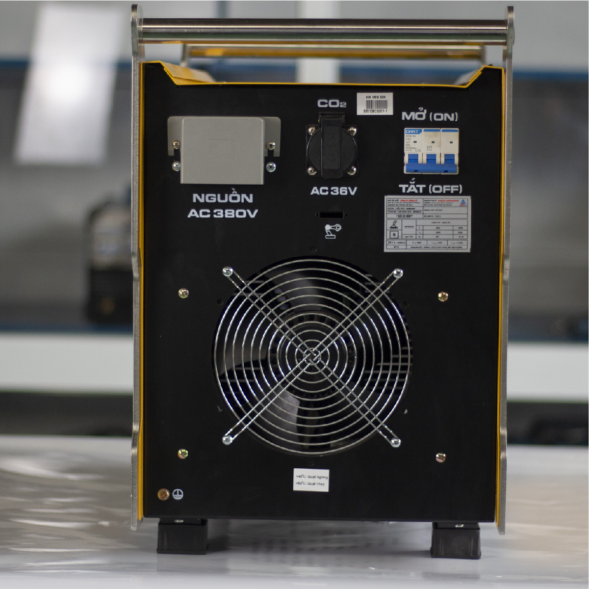 Máy có trọng lượng 40kg, được bao bọc bởi lớp sơn tĩnh điện màu vàng. Đặc biệt, máy có 2 quai xách được làm bằng inox rất chắc chắn, giúp người dùng mang vác di chuyển dễ dàng.