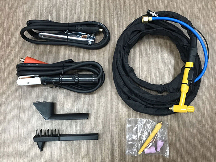 Bộ phụ kiện của máy đi kèm bao gồm: kìm hàn, kẹp mass, búa gõ xỉ, dây hàn tig.