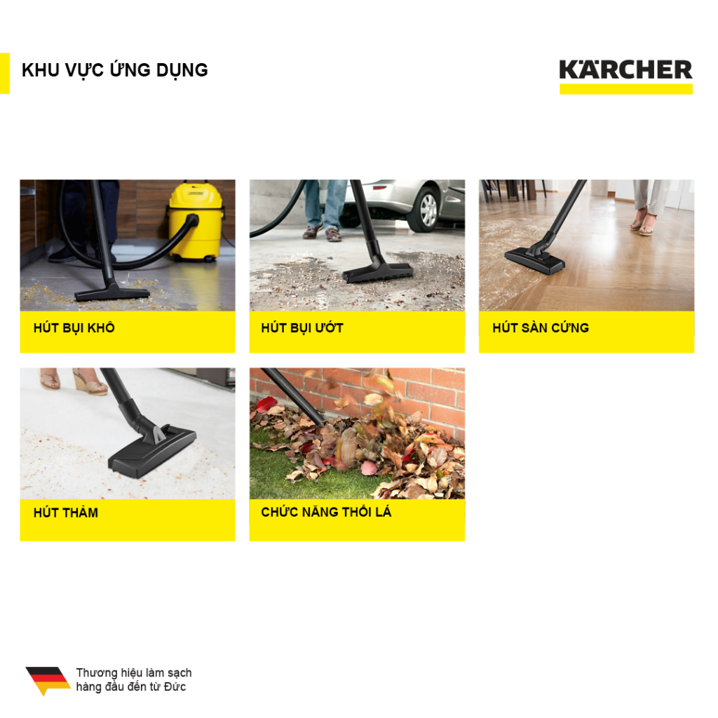 - Karcher mang đến giải pháp làm sạch toàn diện từ vệ sinh sân vườn, vệ sinh nhà cửa cho đến xe, các dụng cụ, vệ sinh bể bơi, tolet...