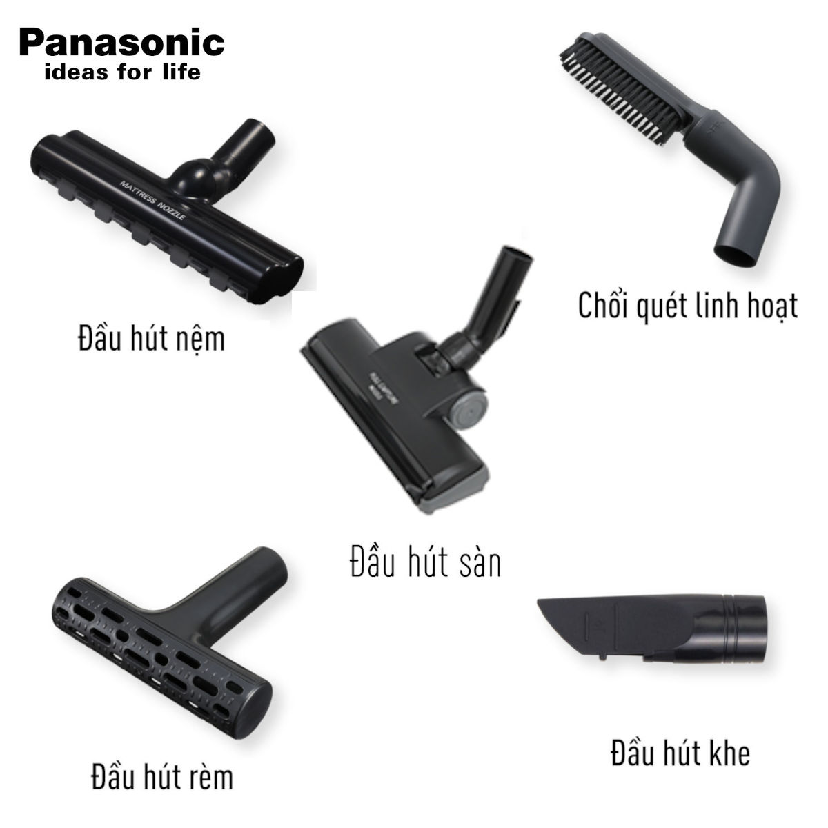 - Phụ kiện đi kèm: Đầu hút nệm / Đầu hút rèm / Chổi quét linh hoạt / Đầu hút khe