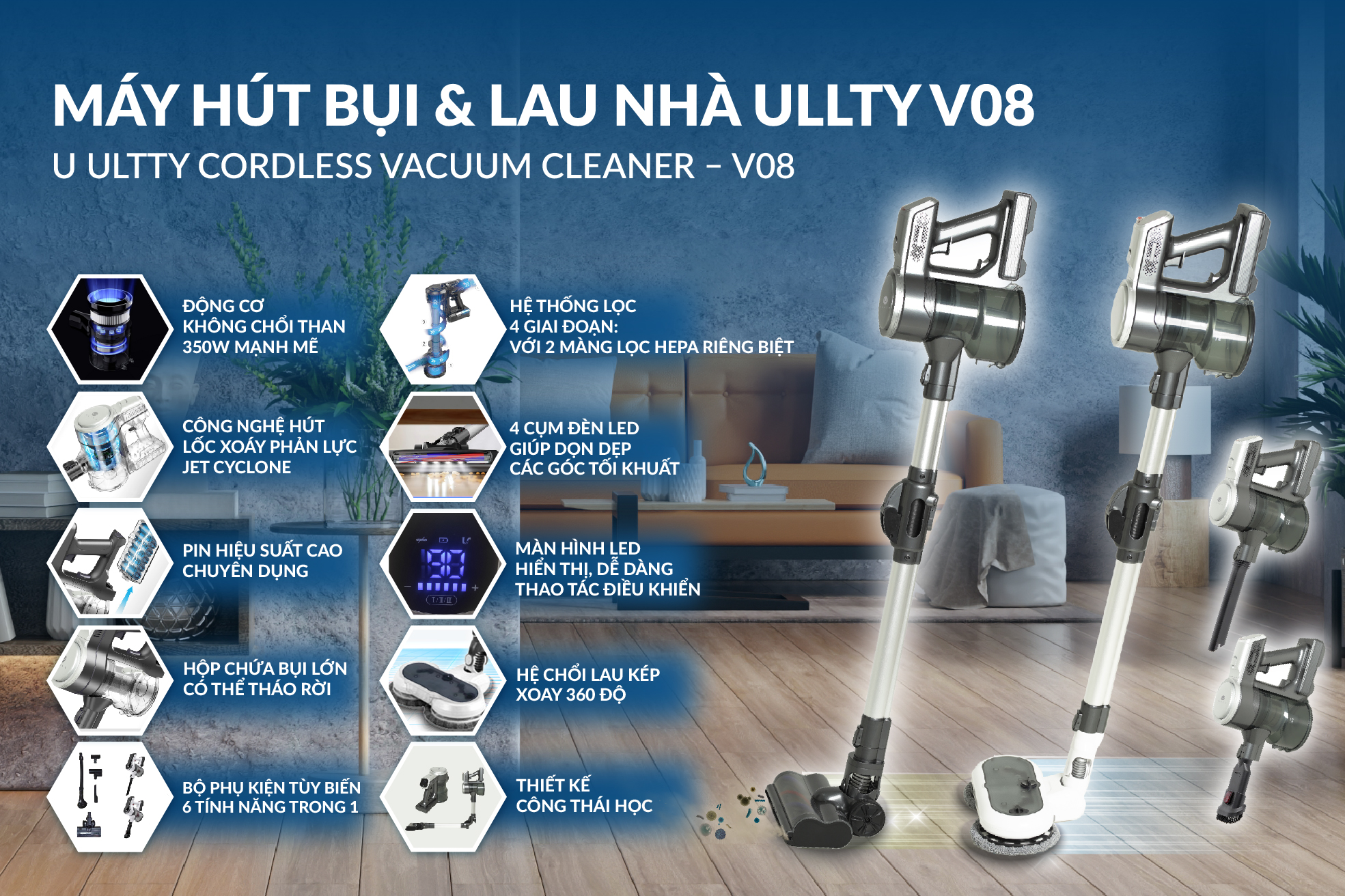 - Chổi quét sàn đa chức năng. sử dụng 3 loại chất liệu bàn chải khác nhau với tuổi thọ cao giúp đảm bảo hoạt động tốt ngay cả trên sàn, thảm trong thời gian dài Máy hút bụi lau nhà cầm tay Ultty V08 là máy hút bụi đa năng , có thể kết hợp sáu công dụng trong một máy gồm : Máy hút bụi lau nhà được thiết kế với sáu công dụng trong một máy đáp ứng được mọi bề mặt mọi ngóc ngách trong căn nhà ,giúp bạn có thể tiết kiệm chi phí với nhiều công dụng trong 1 Bộ phụ kiện đa năng giúp sản phẩm thực hiện năm tính năng khác nhau khi kết nối với từng phụ kiện bao gồm: