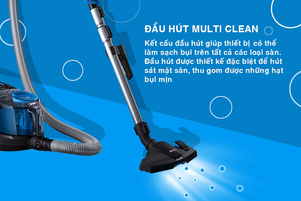 Kết cấu đầu hút giúp thiết bị có thể làm sạch bụi trên tất cả các loại sàn. Đầu hút được thiết kế đặc biệt để hút sát mặt sàn, thu gom được những hạt bụi mịn.