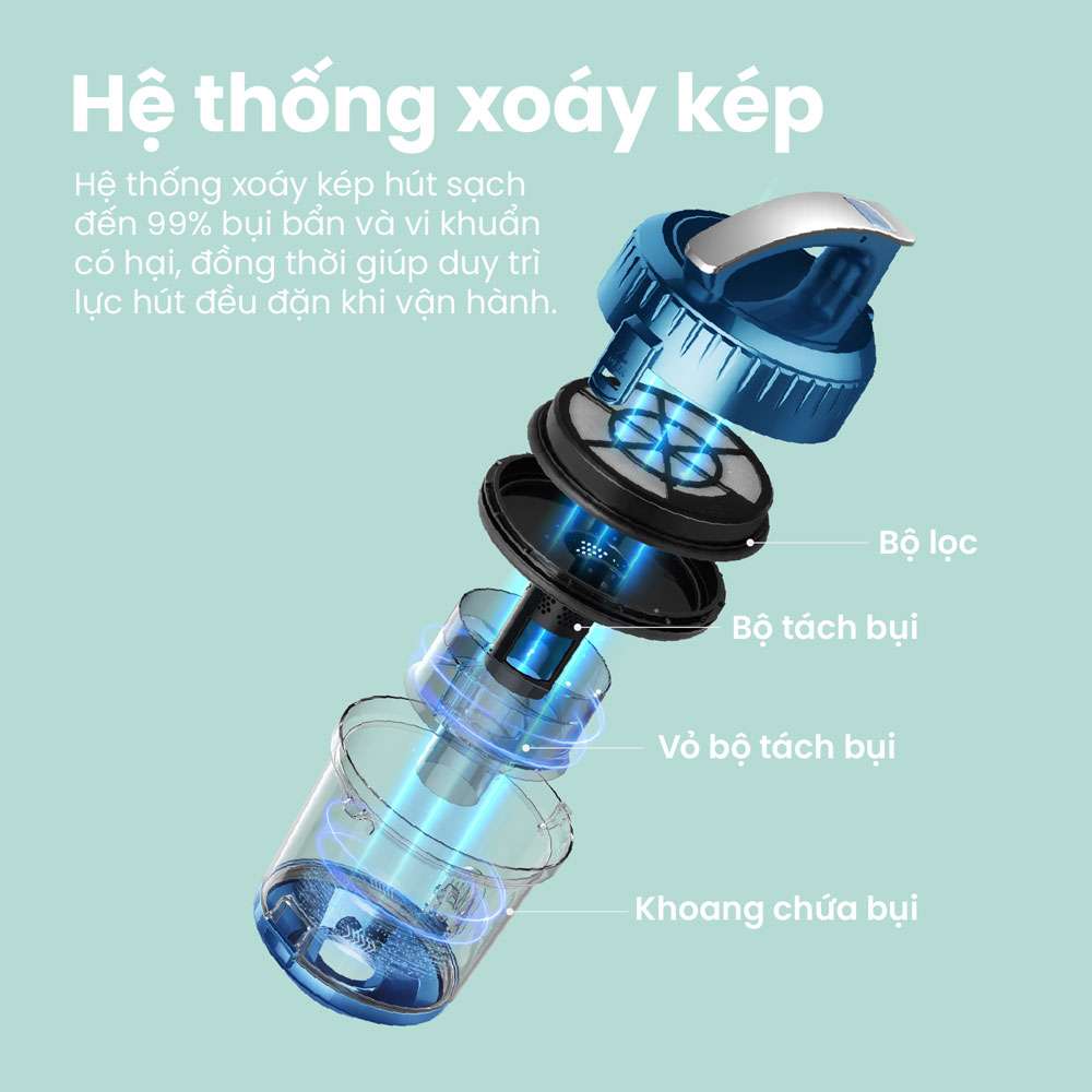 Mang trên mình hệ thống xoáy kép tiên tiến nhất hút cực mạnh các hạt bụi bẩn. Đồng thời còn duy trì lực hút khi vận hành đều đặn. Công suất lớn 1200W đảm bảo không gian của bạn trở nên sạch sẽ nhanh chóng.