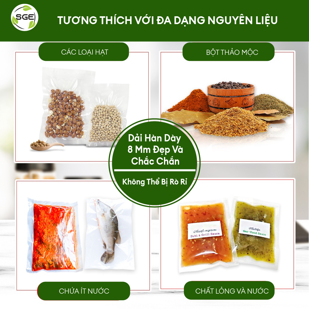 • Có thể hàn được tất cả các loại túi như túi nilon/ túi đông lạnh/ túi xếp hông…và các loại túi khác như túi giấy bạc, túi nhôm, túi kraft, chỉ cần điều chỉnh nhiệt độ dải hàn cho phù hợp với nhu cầu sử dụng và chất liệu túi.