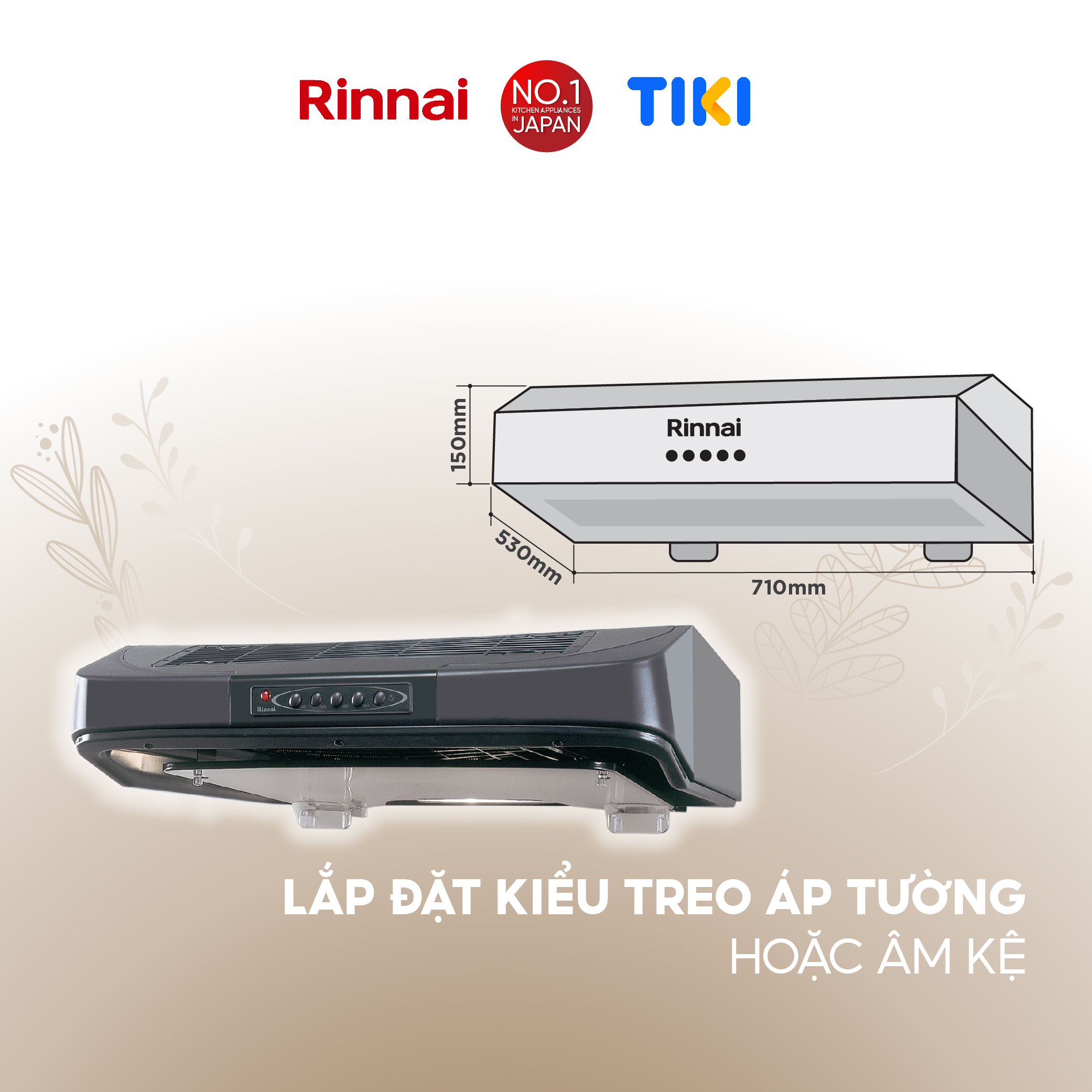 Máy hút mùi 70cm Rinnai RI-H7(Rc-G) than hoạt tính 161W - Hàng chính hãng.   THÔNG TIN CHI TIẾT SẢN PHẨM Máy hút khói Rinnai RI-H7(Rc-G) là sản phẩm đến từ thương hiệu Rinnai - thương hiệu số 1 Nhật Bản. Với khả năng hoạt động êm ái, máy đem lại hiệu suất hút mạnh mẽ, kết hợp với khả năng khử mùi bằng than hoạt tính, giúp loại bỏ hoàn toàn mùi khó chịu trước khi thải ra môi trường. Được xây dựng với khung sườn bền chắc bằng thép không gỉ, sản phẩm mang lại sự đáng tin cậy và có khả năng chịu lực cao.   ĐẶC ĐIỂM NỔI BẬT Điều khiển bằng phím nhấn cơ học Ba tốc độ quạt Một motor, tự ngắt khi quá dòng Lưới lọc được làm bằng nhôm Đèn chiếu sáng (đèn tim) Dòng tự hủy Lắp đặt kiểu treo áp tường hoặc theo kệ   THÔNG SỐ KỸ THUẬT Loại máy: Máy hút khói Số quạt hút: 3 tốc độ quạt Bảng điều khiển: Phím nhấn cơ học Chế độ hoạt động: tự hủy (than hoạt tính) Đèn chiếu sáng (đèn tim) Tự ngắt khi quá dòng Khung sườn: Thép phủ sơn Chất liệu lưới lọc: Hợp kim nhôm Kích thước: 710 x 530 x 150 (mm) Công suất: 161W Trong lượng: 12,2 kg Lưu lượng: 515m3 /h Xuất xứ: Indonesia Thương hiệu RINNAI   THÔNG TIN BẢO HÀNH Bảo hành: 1 năm Trung tâm bảo hành: 1800 54 54 56 Hệ thống CSKH bảo hành: 0868 33 11 88   THÔNG TIN THƯƠNG HIỆU Tập đoàn Rinnai được thành lập vào năm 1950, đến nay đã có hơn 100 năm hình thành và phát triển trong lĩnh vực sản xuất và kinh doanh thiết bị nhiệt năng. Ngoài trụ sở và nhà máy tại Nhật Bản, tập đoàn Rinnai đã có 46 công ty (12 công ty tại Nhật Bản và 34 công ty tại các nước từ Châu Á đến Châu Âu trên thế giới). Tại thị trường Việt Nam vào 14/03/2023, Rinnai Việt Nam một lần nữa nhận được "chứng nhận Hàng Việt Nam chất lượng cao" liên tiếp 23 năm do người tiêu dùng bình chọn.   RINNAI chân thành cảm ơn bạn đã quan tâm đến sản phẩm: Máy hút mùi 70cm Rinnai RI-H7(Rc-G) than hoạt tính 161W - Hàng chính hãng.