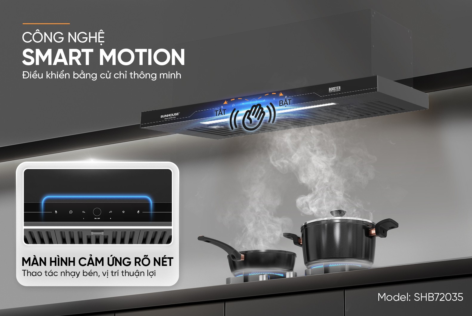 CÔNG NGHỆ SMART MOTION - ĐIỀU KHIỂN CẢM BIẾN CỬ CHỈ THÔNG MINH Máy hút mùi SUNHOUSE SHB72035 ứng dụng công nghệ cảm biến cử chỉ thông minh Smart Motion, mang đến trải nghiệm điều khiển hoàn toàn không chạm. Chỉ với thao tác cái vẫy tay, người dùng có thể dễ dàng bật/tắt máy hoặc điều chỉnh tốc độ hút theo nhu cầu. Tính năng này không chỉ đảm bảo bề mặt máy luôn sạch sẽ, giảm thiểu tiếp xúc trực tiếp để hạn chế vi khuẩn, mà còn tiện lợi khi bận rộn nấu nướng. Bảng điều khiển cảm ứng cùng màn hình hiển thị rõ nét, được đặt ở vị trí dễ dàng quan sát, cho phép thao tác nhanh chóng mà không cần phải cúi xuống hay di chuyển nhiều. Các thông số hiển thị trực quan, giúp người dùng điều chỉnh các chức năng của máy một cách chính xác và hiệu quả.