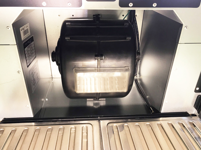 - Hệ thống hút xả tuần hoàn và thông gió, khi dầu mỡ, mùi thực phẩm… được thu vào hệ thống và đi qua lưới lọc, sau đó được lọc qua than hoạt tính để khử mùi, dầu mỡ được giữ lại và đưa về cốc hứng mở trong máy. Khí sau khi được lọc sạch được đẩy ra khỏi máy thông qua đường ống thoát một chiều Ø 150mm.