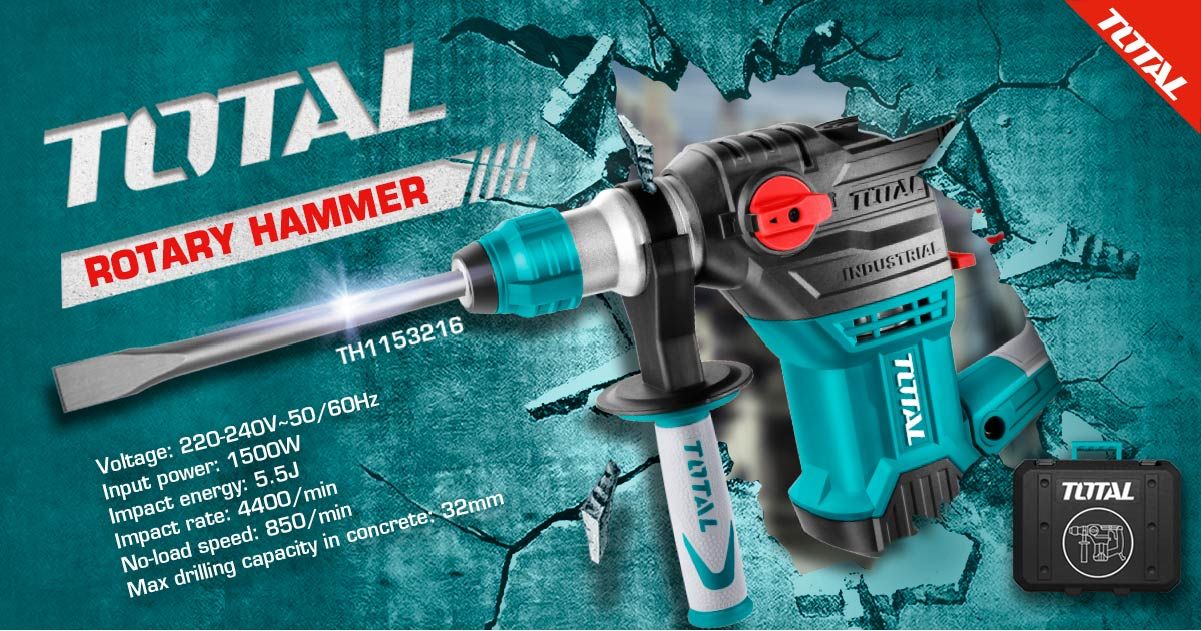 Máy khoan búa xoay Total TH1153216 có hệ thống đục vairo - lock thông minh. Đã được phân phối chính hãng ở thị trường Việt Nam, khả năng khoan trên bề mặt gỗ, kim loại và đục bê tô tốt. Model máy khoan đục này có công suất 1500W, đủ mạnh mẽ dư sức đáp ứng những nhu cầu sử dụng chuyên nghiệp trong công trường xây dựng. Máy cũng có kiểu dáng tinh tế giúp cằm nắm sử dụng trong thời gian dài không bị mỏi tay. Tay cằm của được bọc 1 lớp cao su êm, có độ ma sát cao để tránh trơn trượt khi tay chảy mồ hôi, model này được giới xây dựng đánh giá cao, có khả năng chống rung, đem lại cảm giác tốt khi sử dụng.