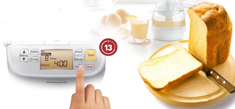 - Sau khi nghe tiếng bíp, lấy bánh mì ra. Định lượng nguyên liệu tự động Máy làm bánh mì Panasonic PALN-SD-P104WRA chính hãng tích hợp bộ định lượng men tự động ở thời điểm thích hợp, giống như một chiếc máy nướng chuyên nghiệp. Bộ định lượng hạt khô cắt nhỏ các phần trái cây khô, hạt và ngũ cốc, giúp các nguyên liệu được phân bổ đều trong ổ bánh. Bộ cảm biến nhiệt độ Chương trình làm bánh mì của dòng PALN-SD-P104WRA điều chỉnh chế độ theo nhiệt độ môi trường. Tổng thời gian nướng bánh của mỗi chương trình giống nhau, không tính điều khiện nhiệt độ. Chức năng hẹn giờ 13 tiếng Máy trang bị chức năng hẹn giờ lên đến 13 tiếng vô cùng tiện dụng, giúp bạn có thể đặt máy tự động tối đa 13 giờ để có thể làm bánh vào buổi tối và thưởng thức vào buổi sáng hoặc khi phải ra ngoài mà vẫn có bánh để dùng khi quay về nhà. 13 thực đơn phong phú Sản phẩm được trang bị sẵn 13 menu với những tùy chọn phong phú để bạn và gia đình có những bữa sáng vui vẻ, đầm ấm. Kiểm soát chất lượng vỏ bánh Ngoài ra, máy làm bánh mì Panasonic PALN-SD-P104WRA còn tích hợp tính năng điều chỉnh chọn màu vỏ bánh nhạt và vừa, đáp ứng sở thích khi dùng bữa. Chức năng ghi nhớ ghi mất điện Nếu mất điện trong quá trình làm bánh, máy sẽ tự động lưu lại bộ nhớ trong tối đa 10 phút và tiếp tục nướng khi có điện trở lại.