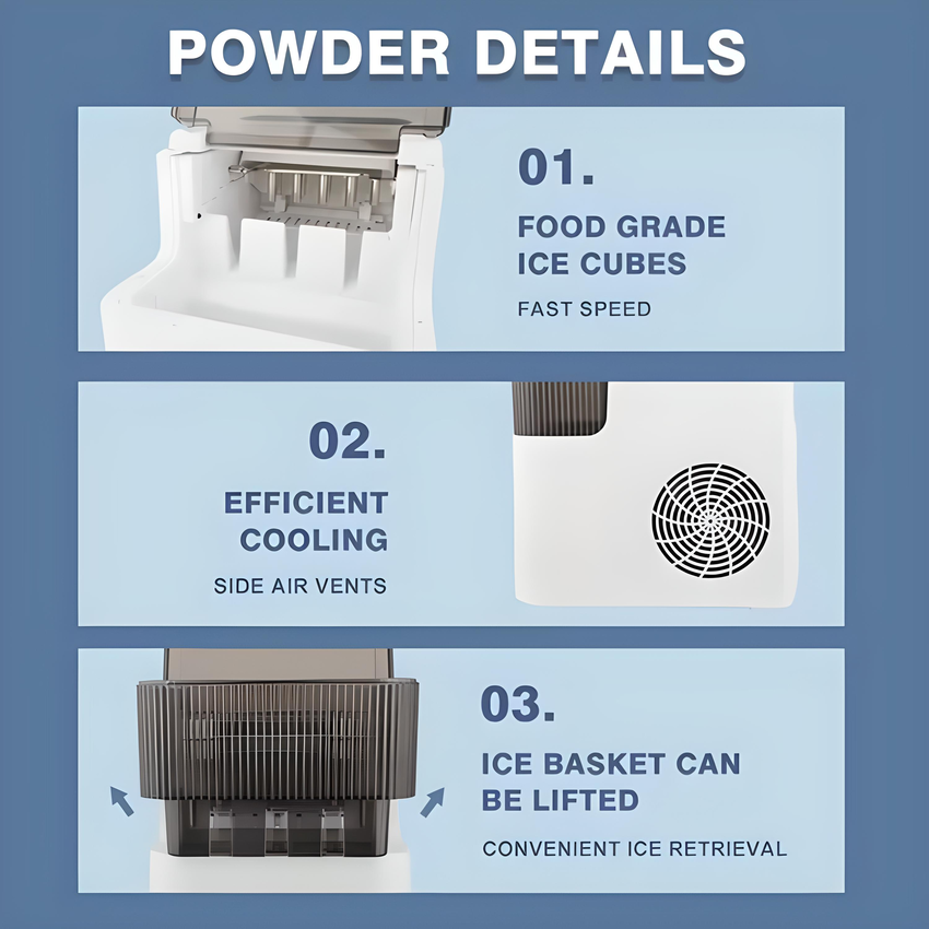 - Máy vận hành không gây ồn ào khó chịu. - Làm đá siêu tốc 06-08 phút.