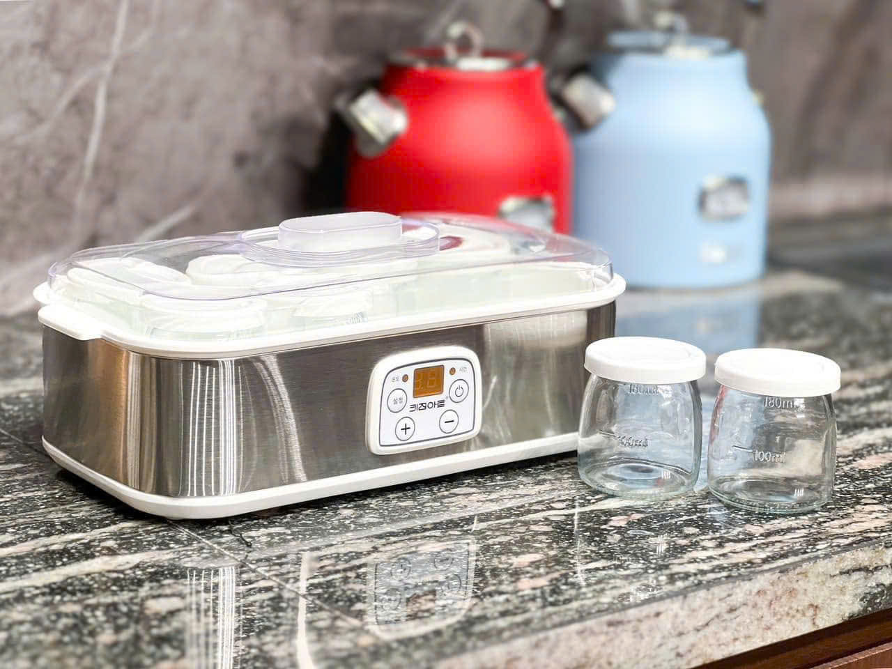 Máy làm sữa chua Kitchen Art (thương hiệu nổi tiếng Hàn Quốc) - Model siêu đẹp, siêu xinh với tính năng hẹn giờ, cài đặt nhiệt độ và bảo vệ quá nhiệt, vô cùng đơn giản để có sữa chua chuẩn ngon, an toàn. Máy làm sữa chua tại nhà Máy làm sữa chua  trang bị 8 cốc thủy tinh trong suốt, mỗi cốc 180ml giúp bạn chuẩn bị món tráng miệng mát lạnh, bổ dưỡng cho cả gia đình. Máy làm sữa chua 8 cốc Tổng dung tích của máy là 1,4 lít, bạn có thể cân bằng lượng sữa tươi, sữa chua phù hợp với sở thích của các thành viên trong gia đình. Màn hình LCD giúp dễ dàng quan sát nhiệt độ Bạn có thể hẹn giờ từ 1 - 48 giờ rất tiện dụng, bạn có thể hẹn giờ tắt tự động. Máy thiết kế màn hình LCD có thể xem cài đặt nhiệt độ và hẹn giờ. Có thể tách rời để vệ sinh Đèn báo nhiệt độ: Đèn nháy liên tục khi nhiệt độ đã được đặt. Đèn hẹn giờ: Đèn sáng liên tục khi thời lượng hẹn giờ đã được đặt.  Bạn có thể chỉnh nhiệt độ tối đa ở mức 55 độ C hoặc thấp hơn tùy thuộc vào lượng sữa chua của bạn. Thân máy sử dụng thép không gỉ sáng bóng, dễ vệ sinh, bao quanh đường viền và nắp máy là nhựa đảm bảo chịu nhiệt, cách nhiệt tốt an toàn khi sử dụng. 8 cốc thủy tinh đi kèm  Bảo hành 24 tháng