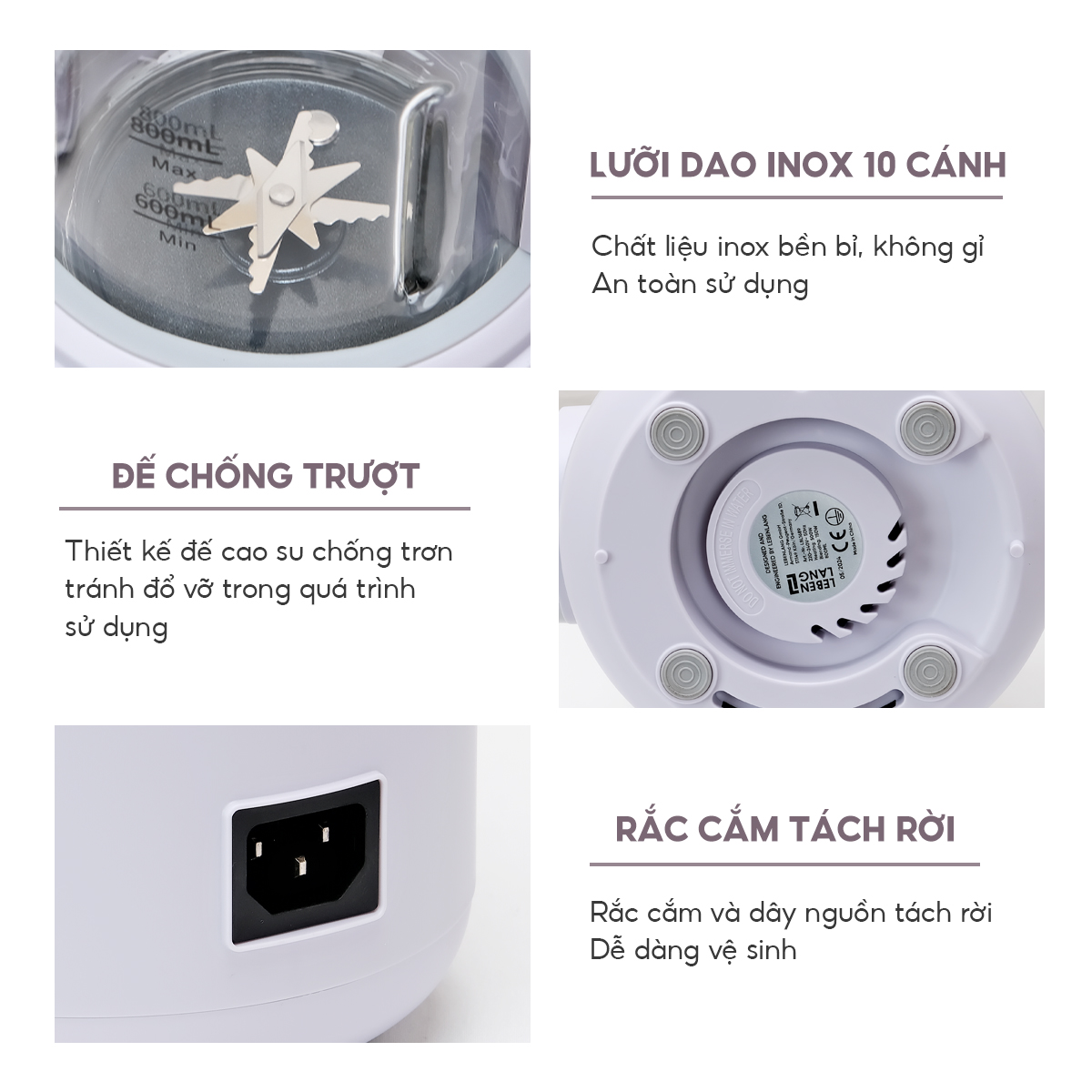 - An Toàn và Tiết Kiệm Điện: Máy xay đa năng LBl1869 thiết kế đế cao su chống trượt, bảo vệ an toàn trong quá trình sử dụng và giảm chi phí điện năng.
