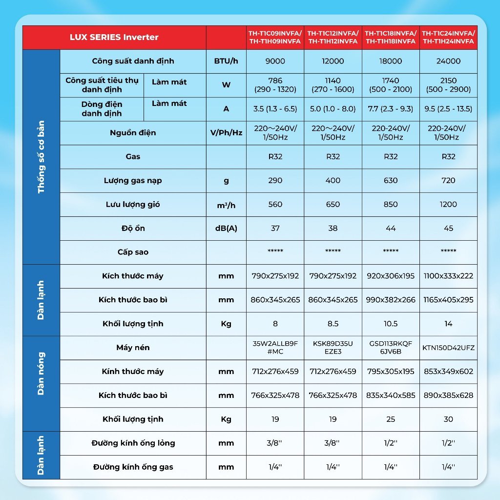 THÔNG SỐ KỸ THUẬT Xuất xứ Thương hiệu : Thái Lan - Sản xuất tại : Thái Lan Loại Gas lạnh R-32 Loại máy Inverter (tiết kiệm điện) Công suất làm lạnh 2.5 HP (2.5