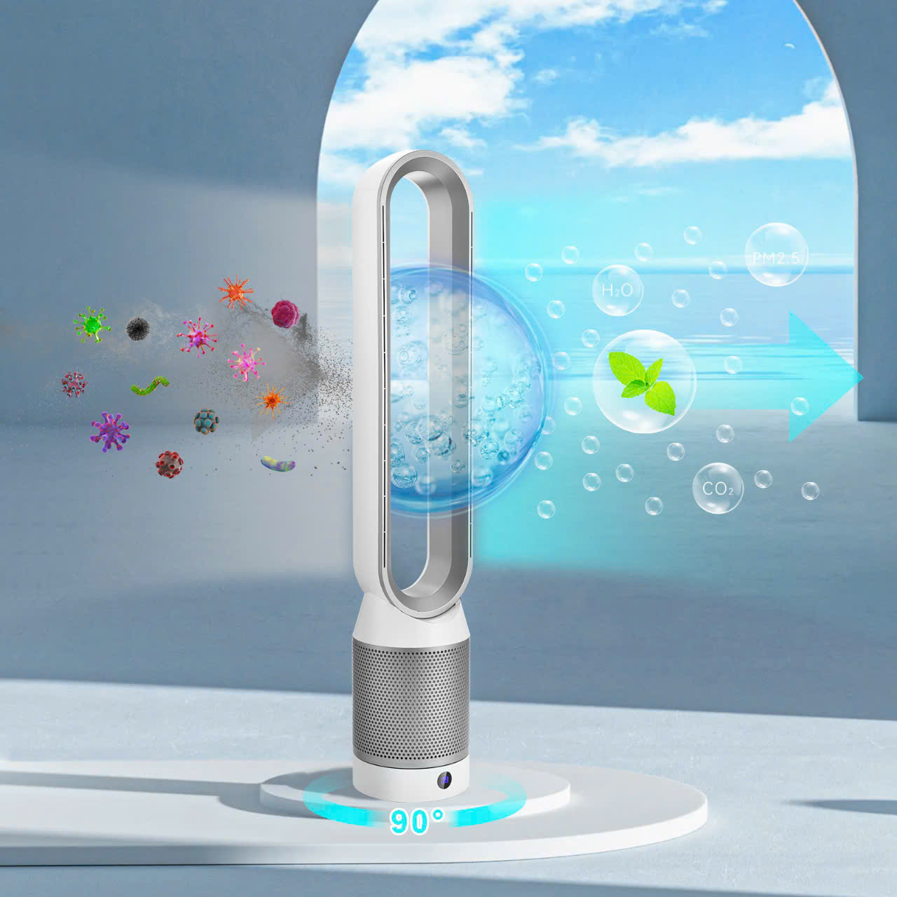 - Màng lọc Cacbon than hoạt tính: Có nhiệm vụ khử mùi hôi, mùi thuốc lá, chất độc, lông động vật và các chất hóa học có trong không khí, mang lại không gian sạch thoáng, dễ chịu. Ngoài khả năng làm sạch bụi bẩn và loại bỏ vi khuẩn, Máy lọc không khí tích hợp quạt KOALA KING mã KAP-001 có chức năng quạt làm mát với với 8 cấp độ gió linh hoạt cho người sử dụng. Quạt thiết kế không cánh đặc biệt an toàn với trẻ nhỏ. Động cơ DC không chổi than (BLDC): Hiệu suất cao, độ bền cao, ít gây tiếng ồn, điều khiển chính xác, tuổi thọ cao. Quạt có góc xoay rộng lên đến 800 giúp gió được điều chỉnh thổi nhiều hướng khác nhau, giúp làm sạch không khí đa chiều, tạo ra gió mát lan tỏa khắp căn phòng nhà bạn và phù hợp khi gia đình tụ họp quây quần bên nhau. Mô tả chức năng điều khiển – Nút nguồn ON/OFF: Nút nguồn ON/OFF dùng để bật/tắt thiết bị. – Nút điều chỉnh tốc độ gió ( Win Speed): Thiết bị có 8 tốc độ gió từ thấp đến cao, sử dụng nút chức năng này để điều chỉnh (tăng/giảm) và lựa chọn tốc độ gió mong muốn. – Nút hẹn giờ (Timing) : Thiết bị có chức năng hẹn giờ tối đa lên đến 8 tiếng, sử dụng nút chức năng này để lựa chọn thời gian hẹn giờ mong muốn. – Nút chế độ gió mạnh (Strong Wind): Khi lựa chọn nút chức năng này thiết bị sẽ hoạt động với mức gió mạnh. – Nút chế độ gió ngủ (Sleep Wind): Khi lựa chọn nút chức năng này thiết bị sẽ hoạt động với mức gió êm dịu. – Nút chế độ quay (Roating): Thiết bị có góc quay rộng 80°, khi nhấn nút chức năng này thiết bị sẽ quay để tỏa gió mát đến các không gian xung quanh.