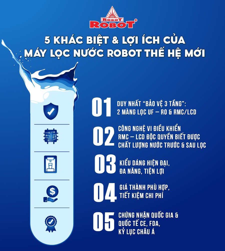 - Vượt qua được những đánh giá kiểm định khắt khe về chất lượng, công nghệ & đáp ứng đầy đủ bộ tiêu chí gắt gao, máy lọc nước ROBOT thế hệ mới đạt được những chứng nhận quốc gia & quốc tế danh giá, như: Tiêu chuẩn quốc gia của Bộ Khoa Học & Công Nghệ, tiêu chuẩn CE Châu Âu, FDA, Đĩa Vàng Sáng Tạo Thế Giới, chất lượng nước lọc đạt chuẩn nước uống của Bộ Y Tế,…