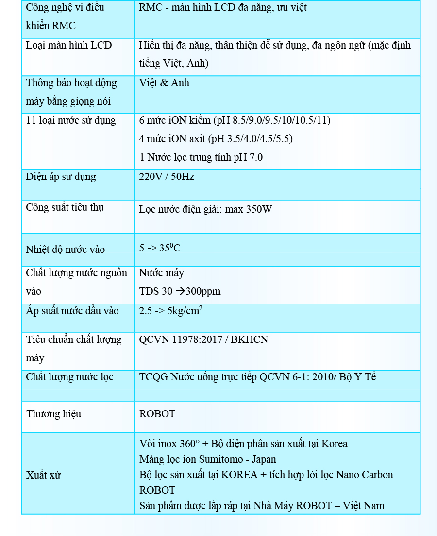 - Hệ thống điều khiển cảm ứng trên mặt phủ kính với màn hình LCD tinh tế ️ + Với mong muốn nhiều gia đình Việt có thể sử dụng nước điện giải iON kiềm với chi phí hợp lý để bảo vệ sức khỏe, sắc đẹp & nâng cao chất lượng cuộc sống, ROBOT mang đến sản phẩm “Chất lượng Quốc tế - Giá thành Việt Nam”, phù hợp với mức sống của nhiều người. Tiết kiệm cho người tiêu dùng đến hơn một nửa chí phí so với máy nhập khẩu chỉ từ 30 – 50%, nhưng sở hữu nhiều ưu điểm, tính năng vượt trội, chất lượng cao. ️ + Chế độ bảo hành chính hãng, tận nơi, vật tư và linh kiện, lõi lọc luôn có sẵn hạn chế tối đa chi phí sửa chữa, bảo trì. VĐV Cầu Lông Nguyễn Tiến Minh – tay vợt từng đứng Top 5 Thế Giới chia sẻ: Sau một thời gian sử dụng Máy lọc nước điện giải iON kiềm Minh thấy cải thiện sức khỏe rất nhiều và tốc độ hồi phục sau tập luyện, thi đấu cũng nhanh hơn so với trước đây. Bây giờ mỗi khi đi tập, hay khi đi thi đấu, Minh đều mang theo nước iON kiềm để uống. ROBOT là một thương hiệu Việt Nam uy tín nên Minh hoàn toàn tin tưởng và lựa chọn Máy lọc nước điện giải iON kiềm ROBOT. ️Thông Tin Thương Hiệu CÔNG TY CỔ PHẦN ĐẦU TƯ ROBOT