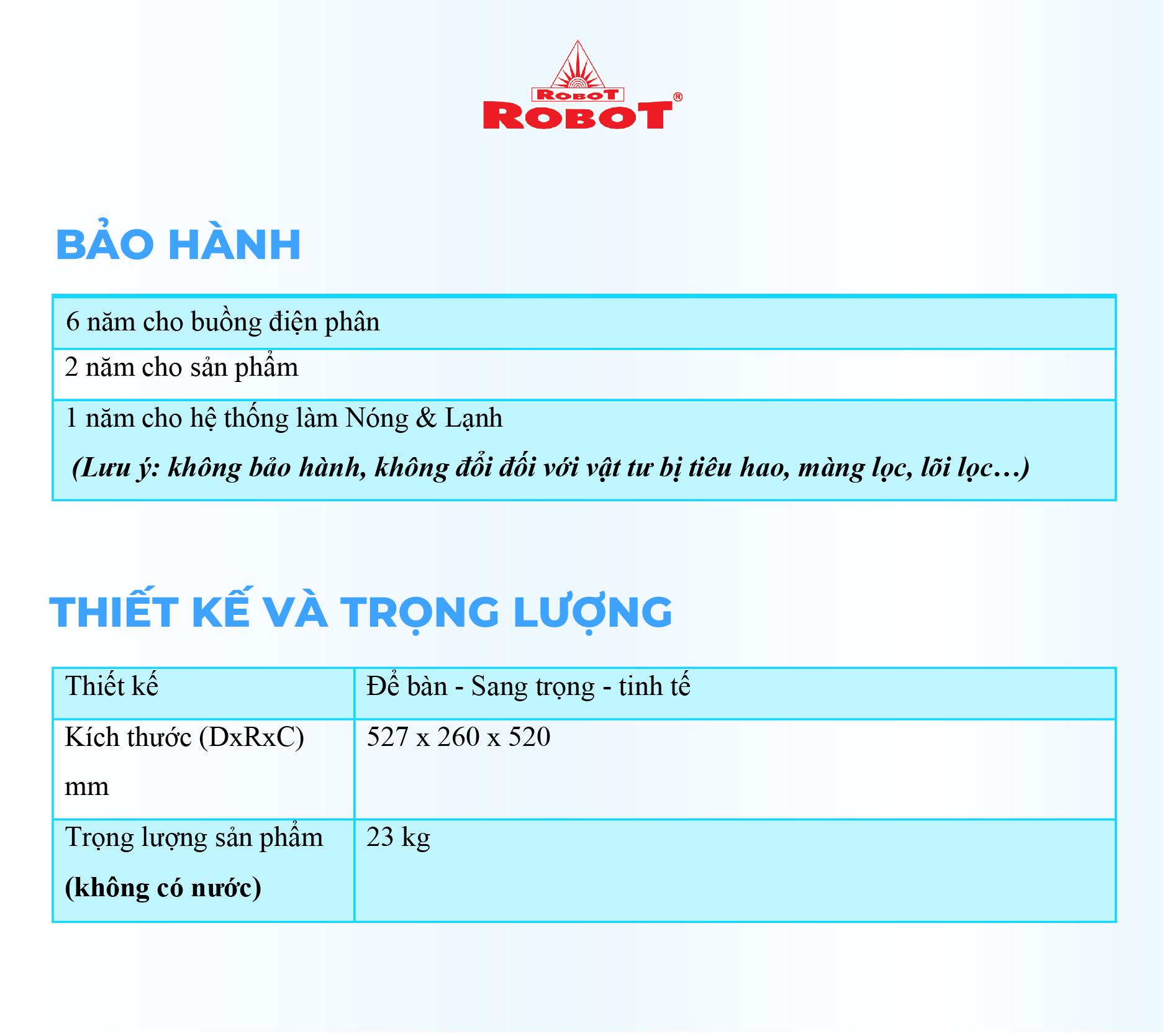 - Và 4 mức nước iON axit (pH 3.5/4.0/4.5/5.5). Chất lượng nước đạt chỉ số tối ưu, nồng độ Hydro hoạt tính lên đến ~ 1500 -> 1800 ppb, chống oxy hóa (ORP) lên đến ~ -850 -> -1000 mV, đáp ứng mọi nhu cầu sử dụng trong cuộc sống. Máy lọc nước điện giải iON kiềm Nóng Lạnh ROBOT ionQueen là dòng Để Bàn đầu tiên trên thế giới, được thiết kế kiểu dáng hiện đại, thiết kế chinh phục mọi không gian. Đặc biệt, được tích hợp thêm chức năng Nóng Thông Minh – Lạnh độc đáo & duy nhất trên thị trường, mang lại nhiều tiện ích cho người dùng. Chỉ số Hydrogen, ORP của nước tùy thuộc số tấm điện cực, đặc tính nguồn nước & “điều kiện đo trong phòng thí nghiệm chuyên nghiệp, đạt chuẩn”. Máy lọc nước điện giải iON kiềm Nóng Lạnh ROBOT ionQueen 1113, tạo 13 loại nước bổ ích, pH 3.5 --> 11.0 - Đáp ứng mọi nhu cầu trong cuộc sống Có thể tham khảo ý kiến của Bác sĩ hoặc chuyên gia dinh dưỡng để được hướng dẫn loại nước uống phù hợp nhất cho cơ thể. Kiểu dáng hiện đại - Thiết kế chinh phục mọi không gian ● Kiểu dáng để bàn, khác biệt so với các dòng điện giải khác ● Sử dụng linh hoạt cho mọi không gian ● Vòi nước điện giải xoay 360° ● Hệ thống điều khiển cảm ứng trên mặt phủ kính với màn hình LCD tinh tế Với mong muốn nhiều gia đình Việt có thể sử dụng nước điện giải iON kiềm với chi phí hợp lý để bảo vệ sức khỏe, sắc đẹp & nâng cao chất lượng cuộc sống, ROBOT mang đến sản phẩm “Chất lượng Quốc tế - Giá thành Việt Nam”, phù hợp với mức sống của nhiều người. Tiết kiệm cho người tiêu dùng đến hơn một nửa chí phí so với máy nhập khẩu chỉ từ 30 – 50%, nhưng sở hữu nhiều ưu điểm, tính năng vượt trội, chất lượng cao. Chế độ bảo hành chính hãng, tận nơi, vật tư và linh kiện, lõi lọc luôn có sẵn hạn chế tối đa chi phí sửa chữa, bảo trì. VĐV Cầu Lông Nguyễn Tiến Minh – tay vợt từng đứng Top 5 Thế Giới chia sẻ: Sau một thời gian sử dụng Máy lọc nước điện giải iON kiềm Minh thấy cải thiện sức khỏe rất nhiều và tốc độ hồi phục sau tập luyện, thi đấu cũng nhanh hơn so với trước đây. Bây giờ mỗi khi đi tập, hay khi đi thi đấu, Minh đều mang theo nước iON kiềm để uống. ROBOT là một thương hiệu Việt Nam uy tín nên Minh hoàn toàn tin tưởng và lựa chọn Máy lọc nước điện giải iON kiềm ROBOT. ️Thông Tin Thương Hiệu CÔNG TY CỔ PHẦN ĐẦU TƯ ROBOT