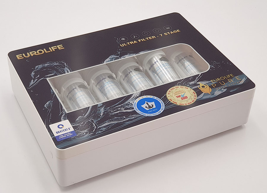 - Lõi Resin ( Lọc mềm) Chức năng: được cấu tạo từ hạt nhựa trao đổi Ion Cation, lõi lọc có khả năng loại bỏ kim loại nặng, chất tẩy rửa, chất hữu cơ và các hoá chất độc hại. Ngoài ra lõi lọc còn có khả năng trao đổi Ion, giữ lại các yếu tố làm nước cứng gây tắc màng như Ca, Mg,.. THIẾT KẾ VƯỢT TRỘI Máy lọc nước Eurolife EL-UF7 được thiết kế với 7 lõi lọc, được định vị chắc chắn trong Panel bằng nhựa PVC cao cấp và mặt kiếng sáng bóng dễ dang lau chùi vệ sinh. Mặt sau được thiết kế với 2 khoen treo đơn giản, dễ dàng lắp đặt. Máy có 3 đầu kết nối : Nước cấp vào, nước xả thải và nước đã lọc. Được phân biệt rõ ràng, dễ kết nối Bạn có thể lắp ngay dưới gầm chậu rửa chén để tiết kiệm không gian và tiện dụng hơn. PHỤ KIỆN ĐI KÈM Phụ kiện kèm Máy lọc nước uống trực tiếp 5 cấp độ lọc Eurolife EL-UF5 bao gồm: Thân máy đã lắp lõi lọc 01; Vòi và phụ kiện 01; Van nối dây và vòi nước ra 01; Ống dẫn nước 04m; Bát gắn vòi 01; Hướng dẫn sử dụng 01; Bộ chia đầu vào 01; Phiếu bảo hành 01; Ốc vít 05; Van khóa 01. Sản phẩm được đi kèm với vòi xả cùng các van đấu nối. LẮP ĐẶT ĐƠN GIẢN Sản phẩm không thể thiếu cho mỗi căn bếp Việt ! Hãy chăm lo sức khỏe của người thân và gia đình của bạn ngay hôm nay, bắt đầu từ nguồn nước thuần khiết mà Eurolife sẽ mang lại cho bạn. Hãy trải nghiệm cùng sản phẩm thương hiệu Eurolife để cảm nhận giá trị chúng tôi mang lại cho khách hàng. Chất lượng, uy tín và dịch vụ hậu mãi tốt luôn là cam kết của chúng tôi. CHẤT LƯỢNG HÀNG ĐẦU Thương hiệu Eurolife Việt Nam là một thương hiệu uy tín hàng đầu trên thị trường Việt Nam với 12 năm kinh nghiệm Các sản phẩm Eurolife đạt nhiều chứng chỉ uy tín trong nước như :