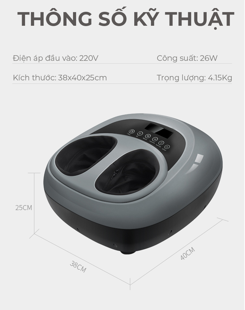 - Máy Massage Chân được thiết kế với túi khí và con lăn ở gan lòng bàn chân đem tới cho người dùng những bài massage chân êm ái, giúp phục hồi xóa bỏ cảm giác đau đớn và mệt mỏi, đem lại cảm giác thư thái, phù hợp với những người thường xuyên vận động và chơi thể thao.