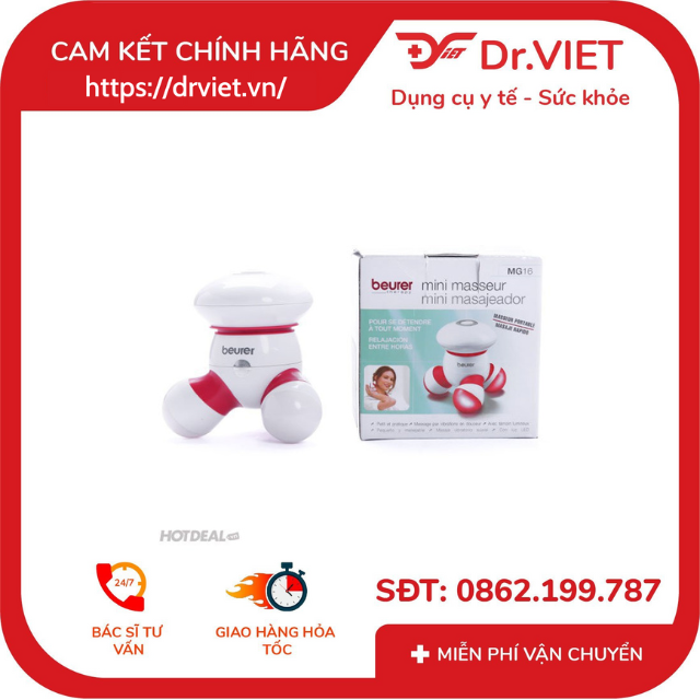 Bộ sản phẩm máy massage mini Beurer Mini MG16 gồm: 1 Máy mát xa Mini Beurer MG16, 3 pin AAA.