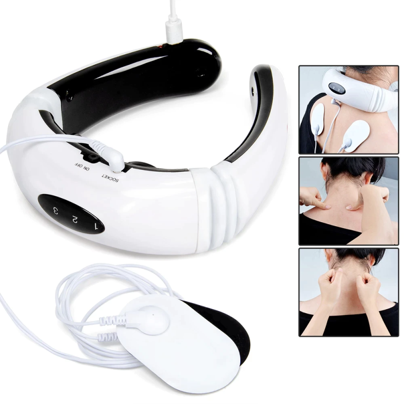 – Trọn bộ sản phẩm gồm: Vòng massage cổ, 1 dây, 2 miếng dán xung điện.