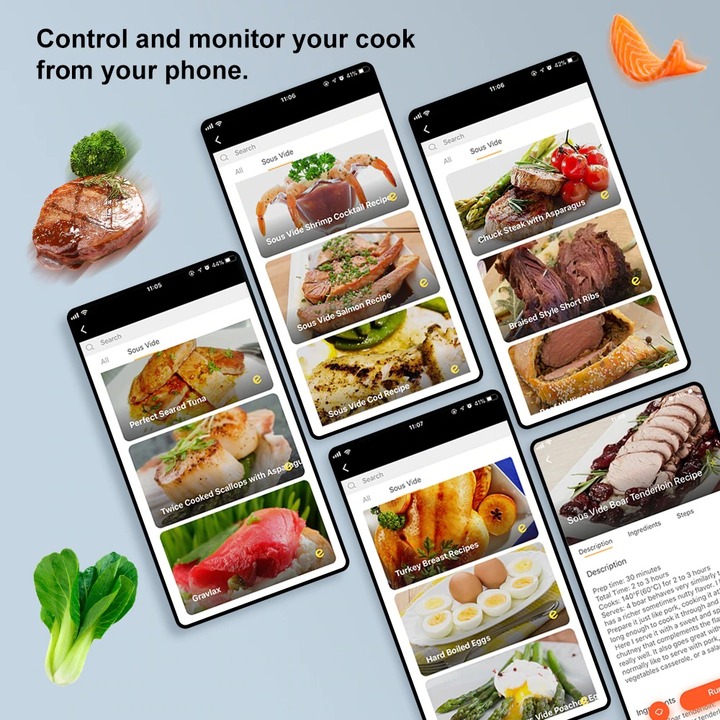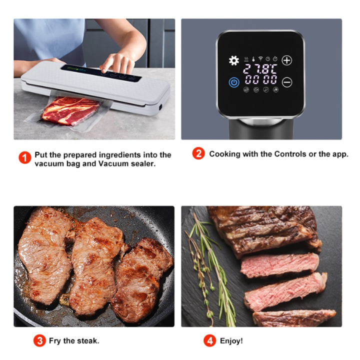- Màn hình LCD lớn, dễ đọc, với chức năng “Bắt đầu trì hoãn” để thuận tiện cho công việc nấu nướng của bạn. Chỉ cần gắn nồi chính xác vào hộp chứa, thêm nước, cho thực phẩm vào túi kín và nhấn nút nguồn 3 giây để bật và bắt đầu nấu chỉ bằng một nút bấm trên thiết bị. Bộ hẹn giờ và điều khiển nhiệt độ chính xác của nồi sous vide cho phép bạn đi chơi và thư giãn trong khi thức ăn của bạn được nấu một cách hoàn hảo. Kết nối thông minh