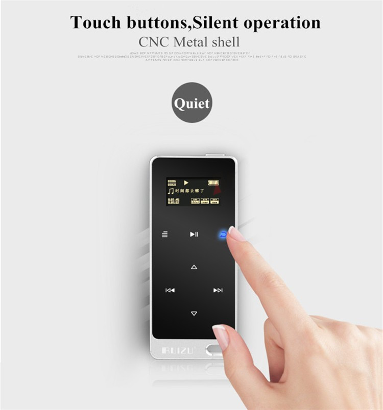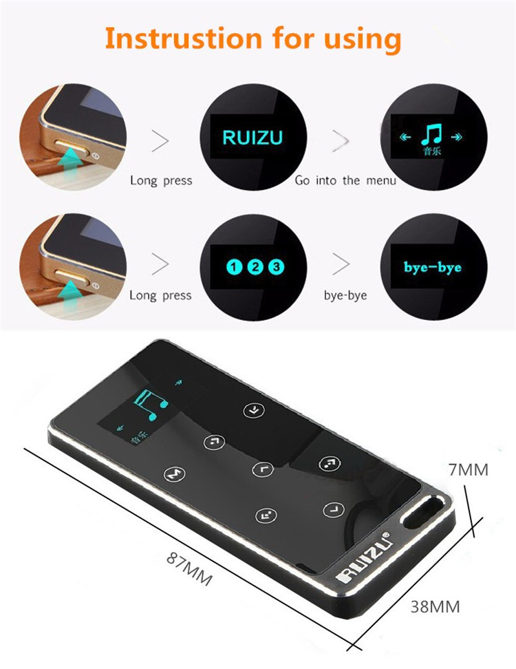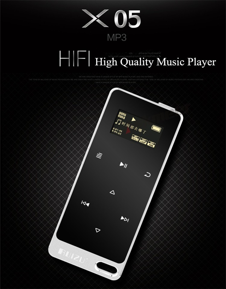 Máy nghe nhạc Lossless RUIZU X05 Bộ Nhớ Trong 8GB   Ruizu X05 thiết kế kiểu dáng nhỏ gọn nhưng đầy chắc chắn, vỏ ngoài được làm hoàn toàn bằng hợp kim nguyên khối, kích thước tương đương với thẻ ATM 87 x 38 x 7mm, trọng lượng 45g. Màn hình tương tác cảm ứng Oled kích thước màn hình 1.1 inches. Các nút điều chỉnh cảm ứng đơn giản hóa cho người dùng. Máy nghe nhạc Ruizu X05 hỗ trợ nhiều định dạng Máy nghe nhạc Ruizu hỗ trợ nhiều định dạng nhạc khác nhau như: lossless APE, FLAC, OGG, MP3, WMA. Thưởng thức âm nhạc của dàn âm thanh ở bất kỳ đâu. Tích hợp thêm ghi âm và đài FM Máy nghe nhạc Ruizu X05 thời gian sử dụng lên đến 100h Ruizu X05 sử dụng pin Lithium cho thời lượng pin lên đến 100h, thời gian nghe nhạc liên tục trong 60h. Có thể mang đi bất kỳ đâu sử dụng trong thời gian dài như thê quả thật đây là thiết bị không thể thiếu đối với những ai yêu thích âm nhạc. Ngoài ra X05 còn có bộ nhớ trong lên đến 8gb cho người dùng lưu trữ những bản nhạc yêu thích được nhiều hơn (không hỗ trợ thẻ nhớ ngoài) TÍNH NĂNG CƠ BẢN