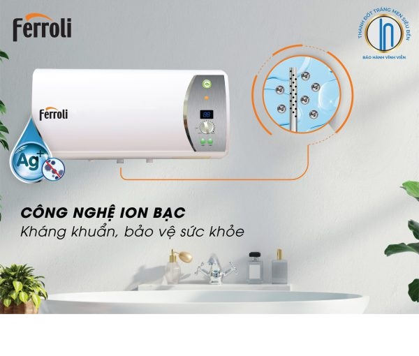 Bình nước nóng Ferroli Verdi AG+ có khả năng kháng khuẩn nhanh chóng, ngăn chặn sự sinh sôi của vi khuẩn E. C Coli, Salmonella, Neglonnella,.. nấm mốc và các loại vi khuẩn khác.