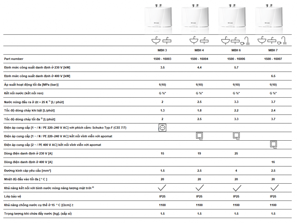 Được thừa hưởng phong cách thiết kế tinh xảo của nền công nghiệp Đức – Các sản phẩm thuộc dòng MBH sở hữu dáng vẻ hiện đại, nhỏ gọn, chắc chắn và cực kỳ tối ưu cho người sử dụng. Công nghệ độc quyền, an toàn tuyệt đối. Kể từ khi thành lập năm 1951, nhờ phát hiện ra khả năng ứng dụng nguyên tắc vật lý cơ bản vào thực tế sản phẩm là dùng trở kháng cao của dòng nước để tạo thành 1 điện trở tự nhiên, giúp cách ly dòng điện đảm bảo an toàn cho người dùng. CLAGE đã triệt để áp dụng nguyên tắc này trong các thiết bị của mình. Hiện tại, CLAGE đang là thương hiệu sở hữu độc quyền công nghệ này trên toàn thế giới. Nhiệt độ nước đầu ra được kiểm soát tối ưu, hoàn toàn không cần pha thêm nước lạnh để đạt được nhiệt độ nước mong muốn, cũng không cần lo lắng về nhiệt độ nước quá nóng gây nguy hiểm cho người dùng. Theo các thông số kỹ thuật như công suất máy, dòng điện đầu vào và lưu lượng nước đầu ra, máy nước nóng tức thì dòng MCX sẽ được chia thành MBH 3, MBH 4, MBH 6, MBH 7.