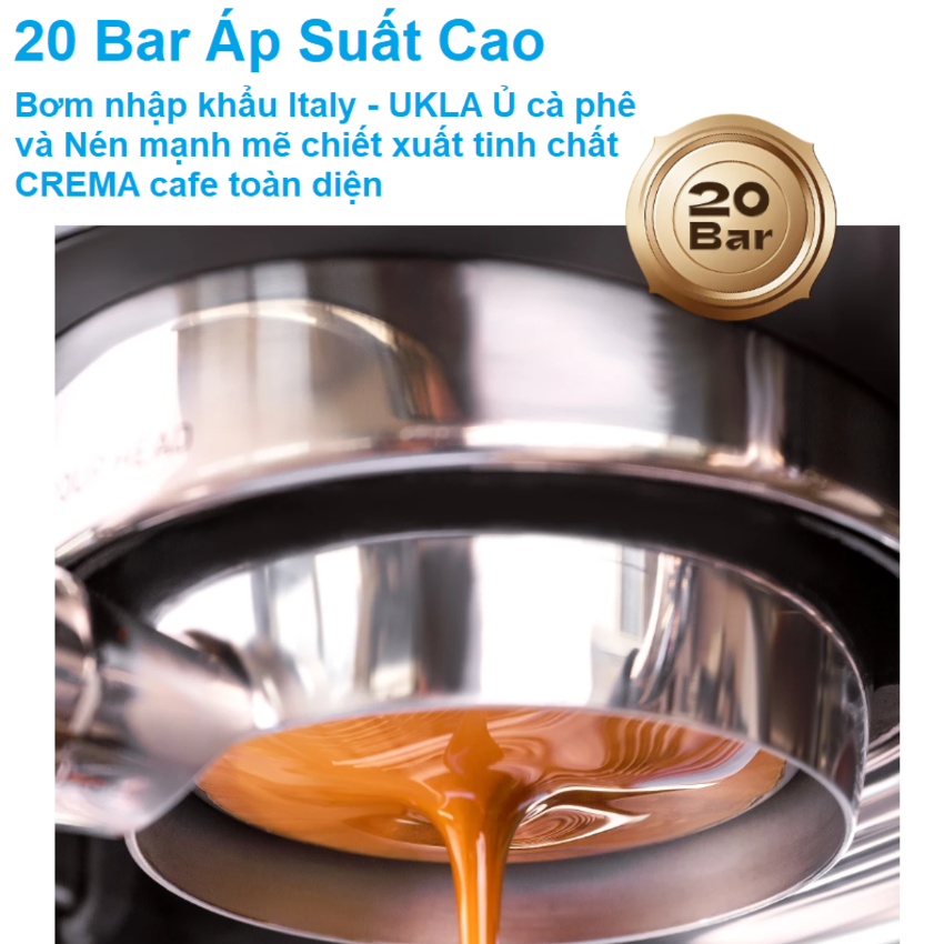 - Pha cà phê espresso, xay hạt, tạo bọt sữa và đồng hồ do áp suất 3 trong 1