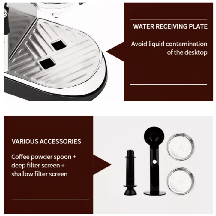 - Đặc biệt, máy còn thiết lập hệ thống tạo bọt sữa: Bọt kem cho Cappuccino với thiết kế vòi xoay linh hoạt 360 độ. Kết hợp với giá giữ bộ lọc chuyên nghiệp làm bằng vỏ nhôm cao cấp và 2 phin lọc: Một tách, hai tách Khay hứng nước nhỏ giọt có thể tháo rời