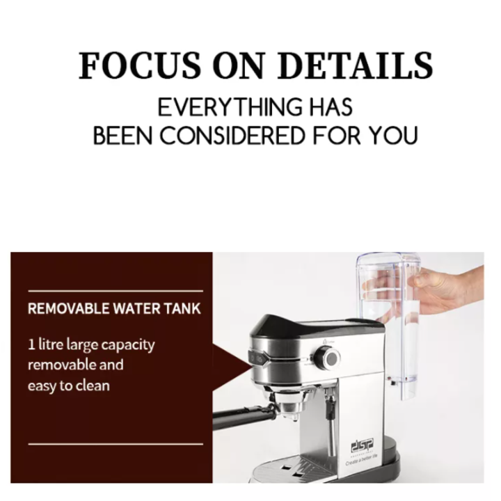Máy pha cà phê Espresso nhãn hiệu DSP KA3065 - Áp suất 15 bar, có công suất hoạt động mạnh mẽ lên đến 1450W - HÀNG NHẬP KHẨU Thiết kế nhỏ gọn, hiện đại -