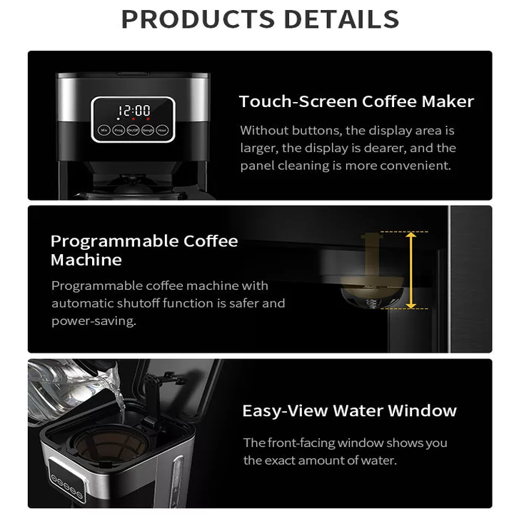 - Dung tích bình chứa 1500ml ( tương ứng 10 tách) - Bảng điều khiển màn hình LCD của máy pha cà phê có thể hiển thị chế độ pha, thời gian pha và lựa chọn cường độ pha Máy pha cà phê Shardor CM1429TA-GS được thiết kế thành 4 phần riêng biệt: