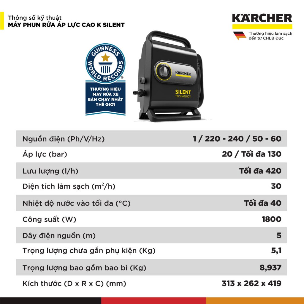 ✨Máy phun rửa áp lực cao Karcher K Silent - Công suất 1800W, áp lực tối đa 130 bar - Bảo hành chính hãng 24 tháng - Hàng Chính Hãng