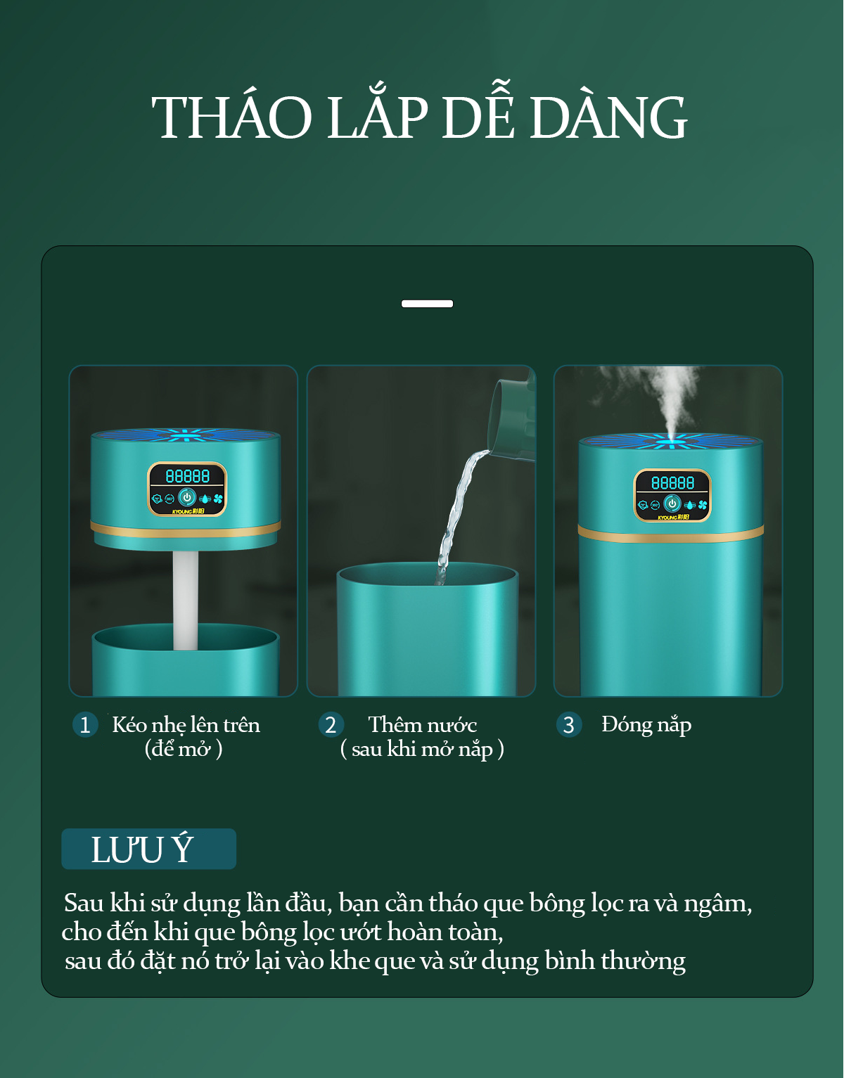 - bước 3: đóng nắp lại và sử dụng theo hướng dẫn Lưu ý khi sử dụng máy phun sương nano, máy tạo ẩm, máy xông tinh dầu teement :