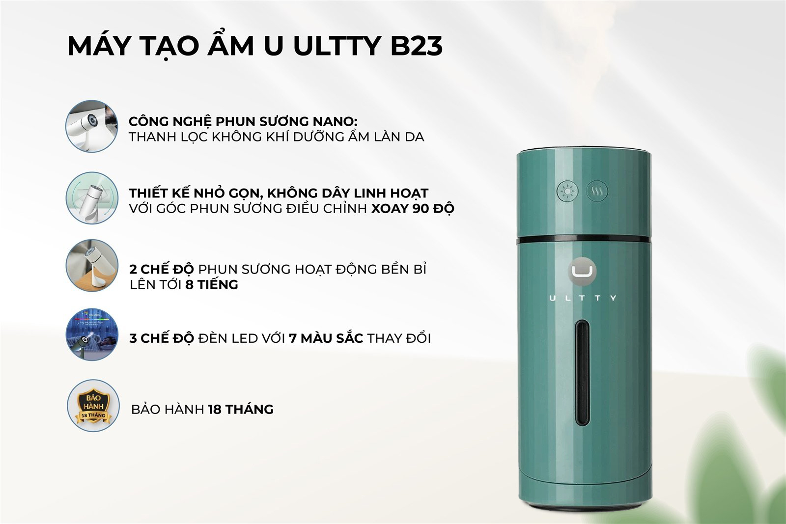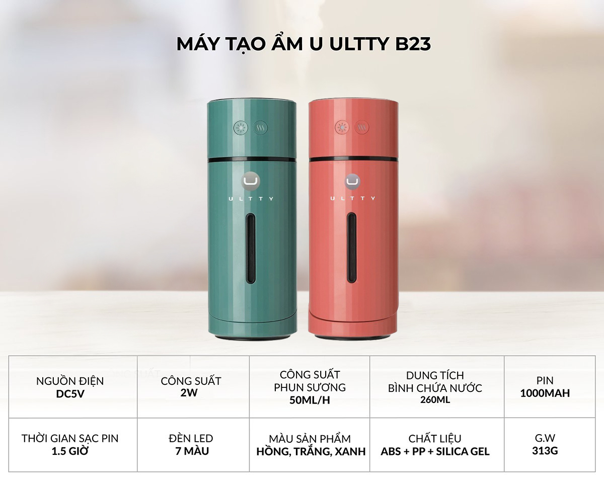 - Với kích thước nhỏ gọn 7.2 x 7.2 x 18 (cm), U ULTTY B23 hoàn hảo cho ô tô, máy tính để bàn hoặc phòng ngủ nhỏ.