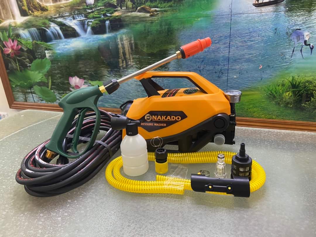 MÁY RỬA XE NAKADO 2500W 100% DÂY ĐỒNG được sản xuất theo công nghệ Nhật Bản, máy có thiết kế gọn nhẹ, đẹp mắt, dễ dàng cầm, xách đi mọi nơi. Máy được trang bị mô tơ lõi đồng cảm ứng từ chạy êm, ít ồn, bền hơn các loại chổi than cũ, máy rửa xe tự động, khi không bóp máy sẽ dừng hoạt động. Máy rửa xe gia đình mini phù hợp rửa xe, rửa sân, kho bãi, rửa máy lạnh….