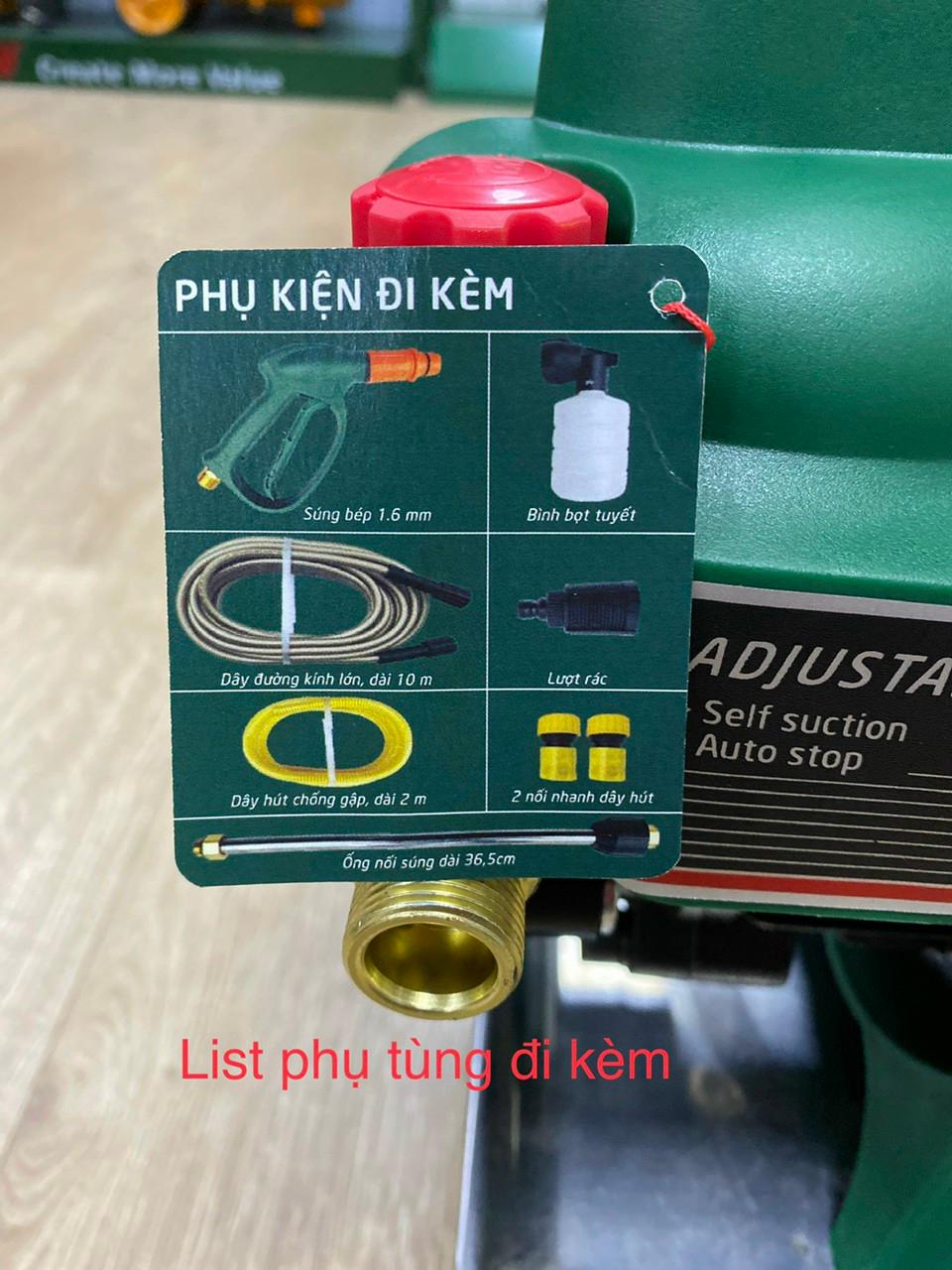 * QUÀ TẶNG : - Dây cao áp 15m. - Ống nước 1m8. - Bình đựng xà phòng, cút lọc rác thân máy, cút lọc rác. - Thanh nối dài, đầu nối vào dây, kim