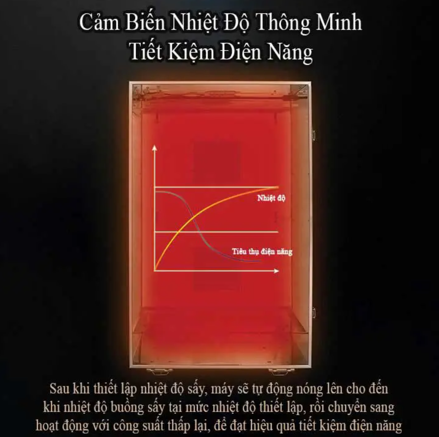 - Chính hệ thống gia nhiệt 360 độ thông minh này giúp thực phẩm được sấy chín đều, ngon và khô nhanh hơn từ 40 đến 50% so với dòng mày thường. Rút ngắn thời gian sấy và tiết kiệm điện năng tiêu thụ đáng kể. Đây chính là điểm khác biệt lớn so với các dòng máy thông thường.