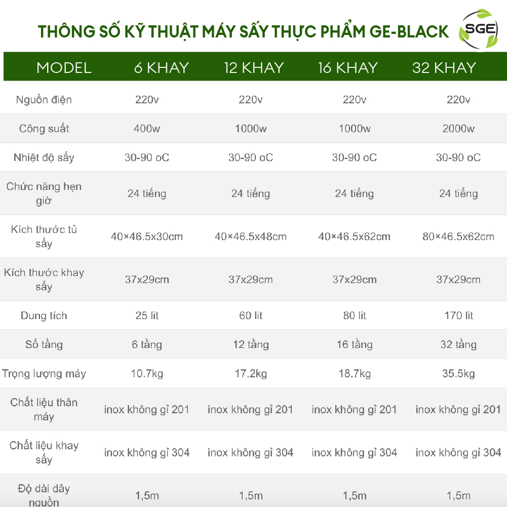 Máy Sấy Thực Phẩm Ge-Black- Đầy Đủ Chức Năng, Đủ kích thước 6-32 khay. Chính Hãng SGE Thái Lan