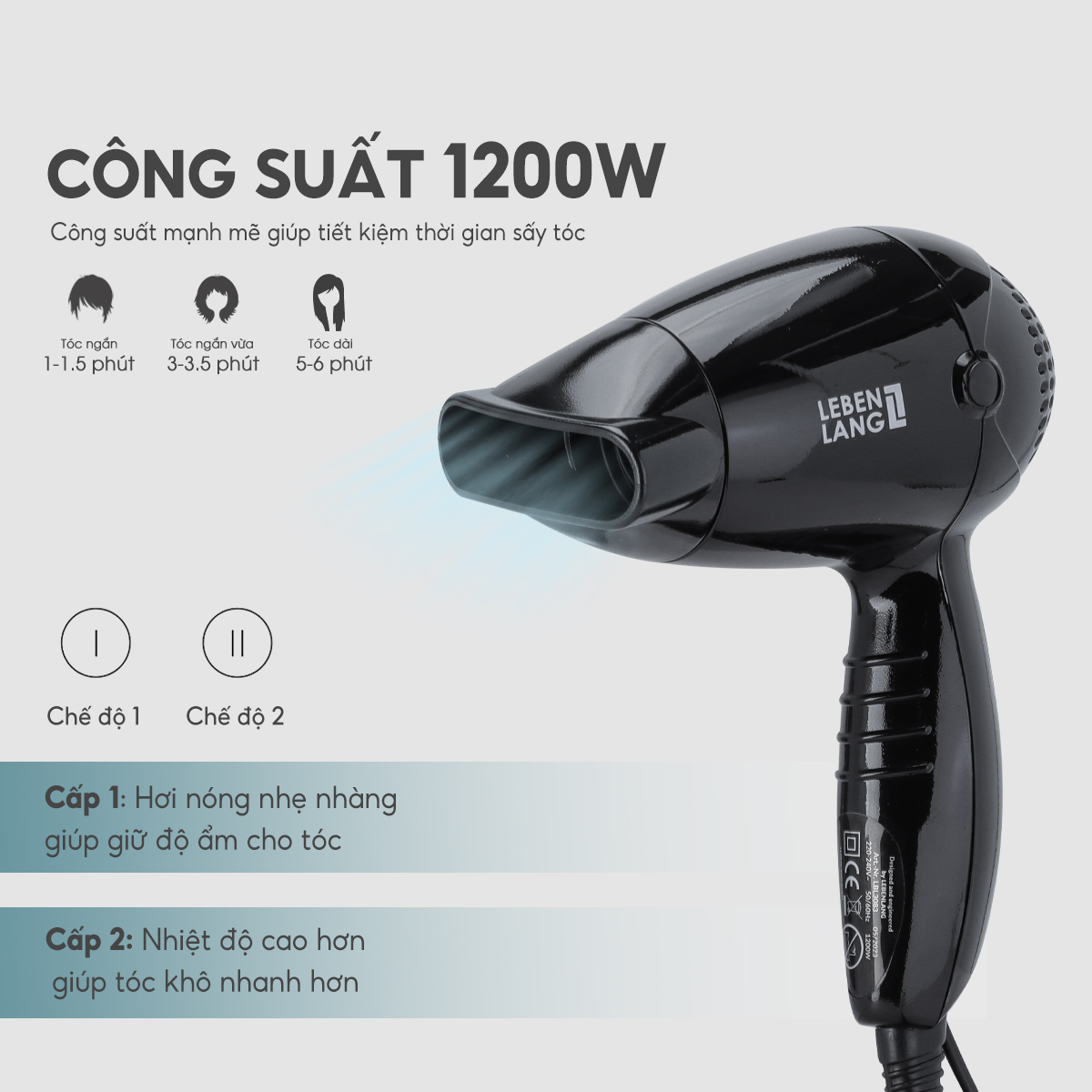 - Công Suất Mạnh Mẽ 1200W: Máy sấy tóc mini Lebenlang LBL3083 với công suất 1200W giúp bạn sấy khô tóc nhanh chóng và hiệu quả, tiết kiệm thời gian cho cuộc sống bận rộn của bạn.