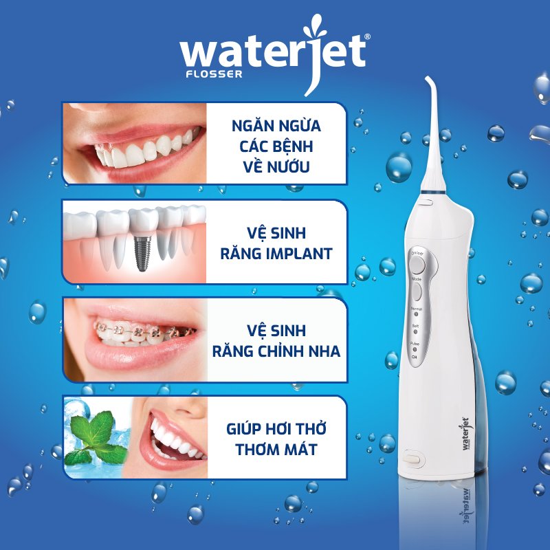 Máy tăm nước cá nhân không dây Waterjet Flosser Cordless Advanced (4 đầu tăm, dùng được cho người niềng răng) Sử dụng Máy tăm nước không dây Waterjet Cordless Advanced ngay hôm nay trong việc làm sạch răng của bạn.   THÔNG TIN SẢN PHẨM MÁY TĂM NƯỚC WATERJET CORDLESS ADVANCED: – Loại máy: Không dây sử dụng nguồn pin sạc. – Thương hiệu: WaterJet – Sản xuất tại: Trung Quốc – Khoảng áp lực nước: 40 to 90 PSI – Tấn số đập nước: 1.400 lần/phút – Dung tích bình chứa: 150 ml – Hẹn giờ tắt tự động: 2 phút – Số mức áp lực nước: 3 – Số đầu tăm kèm theo máy: 4 (2 tiêu chuẩn, 1 chỉnh nha, 1 nội nha) – Nút ON/OFF trên tay cầm: Có – Đầu tăm có thể xoay 360 độ: Có – Độ ồn thấp: ≤75dB – Kích cỡ: 55x75x195 mm – Pin: Pin Li-ion bên trong, dùng liên tục đến 20 giờ – Điện áp: AC 100-240V – Bảo hành: 12 tháng   ĐỐI TƯỢNG SỬ DỤNG MÁY TĂM NƯỚC WATERJET CORDLESS ADVANCED: – Dùng vệ sinh răng miệng hằng ngày cho mọi người. – Dùng vệ sinh cho bệnh nhân viêm nướu, chỉnh nha, cấy ghép implant…   CÔNG DỤNG MÁY TĂM NƯỚC WATERJET CORDLESS ADVANCED: • Giúp giữ cho răng sạch sẽ: Nhờ vào áp lực của tia nước, mọi mảnh vụn thức ăn nhét trong kẽ răng và mảng bám trên răng sẽ được lấy đi thật sạch sẽ, kể cả những nơi khó chải rửa nhất.   • Massage nướu: Nhờ vào áp lực của tia nước, nướu răng được massage, kích thích việc lưu thông máu, giúp người sử dụng cảm thấy dễ chịu, thoải mái và sạch sẽ.   • Ngăn ngừa các bệnh về nướu: Nhờ vào áp lực của tia nước, mọi vi khuẩn và mảng bám nằm sâu dưới nướu răng cũng sẽ được lấy sạch, ngăn ngừa sự hình thành và phát triển các bệnh về nướu như viêm nướu, tuột nướu.   • Là sự lựa chọn tốt nhất cho những người có tiền căn bị bệnh viêm nha chu, viêm nướu: Nhờ sử dụng loại đầu bơm rửa đặc dụng được thiết kế dạng mềm, áp suất nước thấp, dành riêng cho những người có tiền căn bị viêm nha chu, chảy máu nướu răng, viêm nướu nặng, có thể giúp người sử dụng vệ sinh những vùng dưới nướu một cách dễ dàng, cải thiện tình trạng nướu răng một cách nhanh chóng.   HƯỚNG DẪN SỬ DỤNG MÁY TĂM NƯỚC WATERJET CORDLESS ADVANCED: Hướng dẫn sạc pin: – Cắm cục sạc vào ổ cắm điện, đèn LED sẽ sáng màu xanh. – Cắm đầu còn lại vào lỗ sạc tại phía trước thân máy, đèn LED sẽ sáng màu đỏ. Khi màu đỏ đèn LED sáng lên, quá trình sạch điện bắt đầu. – Pin: Pin Li-ion bên trong, dùng liên tục đến 20 giờ   Chuẩn bị nước: – Lấy bình chứa nước ra khỏi máy và cho nước vào. Đặt bình nước trở lại bên trên thân máy. Ấn bình nước sao cho gắn chặt vào thân máy.   Gắn đầu tăm: – Chọn đầu tăm thích hợp và gắn vào tay cầm. Ấn cho đầu tăm gắn thật chặt.   Thay đổi áp suất: – Chỉnh áp suất đến mức ưa thích bằng cách trượt nút điều chỉnh lên xuống   Tay cầm điều khiển: – Máy tăm nước được trang bị nút tạm ngưng trên tay cầm. Bạn có thể tạm thời ngưng dòng nước bằng cách ấn nút tạm ngưng trê tay cầm. Điều khiển hướng của dòng nước bằng cách xoay nút phía trên tay cầm.   Mở/ tắt máy máy tăm nước Waterjet Cordless Advanced: – Sau khi đã đặt đầu tăm vào bên trong miệng, bật máy bằng tay còn lại. Mím môi để tránh nước bắn ra. Luôn luôn ấn nút tạm ngưng hay tắt máy khi rút đầu tăm ra khỏi miệng. ƯU ĐIỂM NỔI BẬT CỦA MÁY TĂM NƯỚC KHÔNG DÂY WATERJET CORDLESS ADVANCED