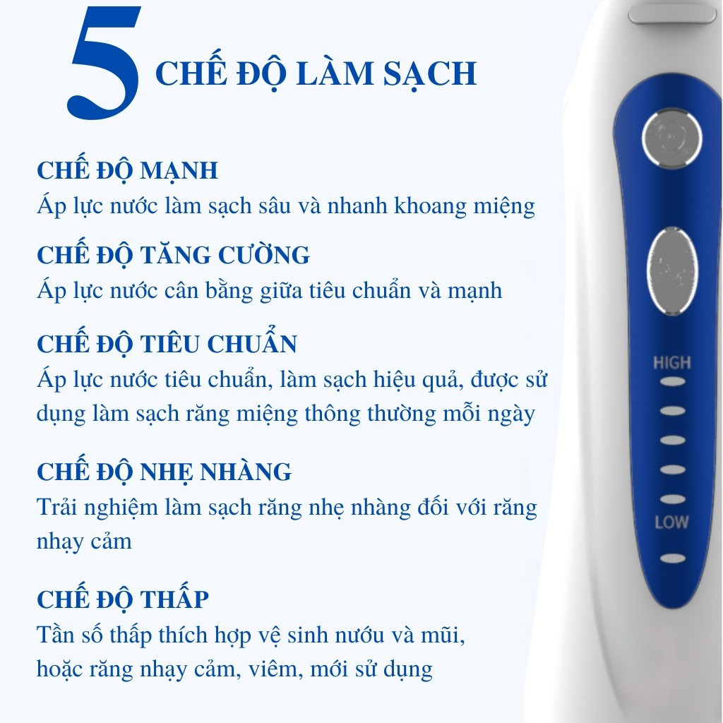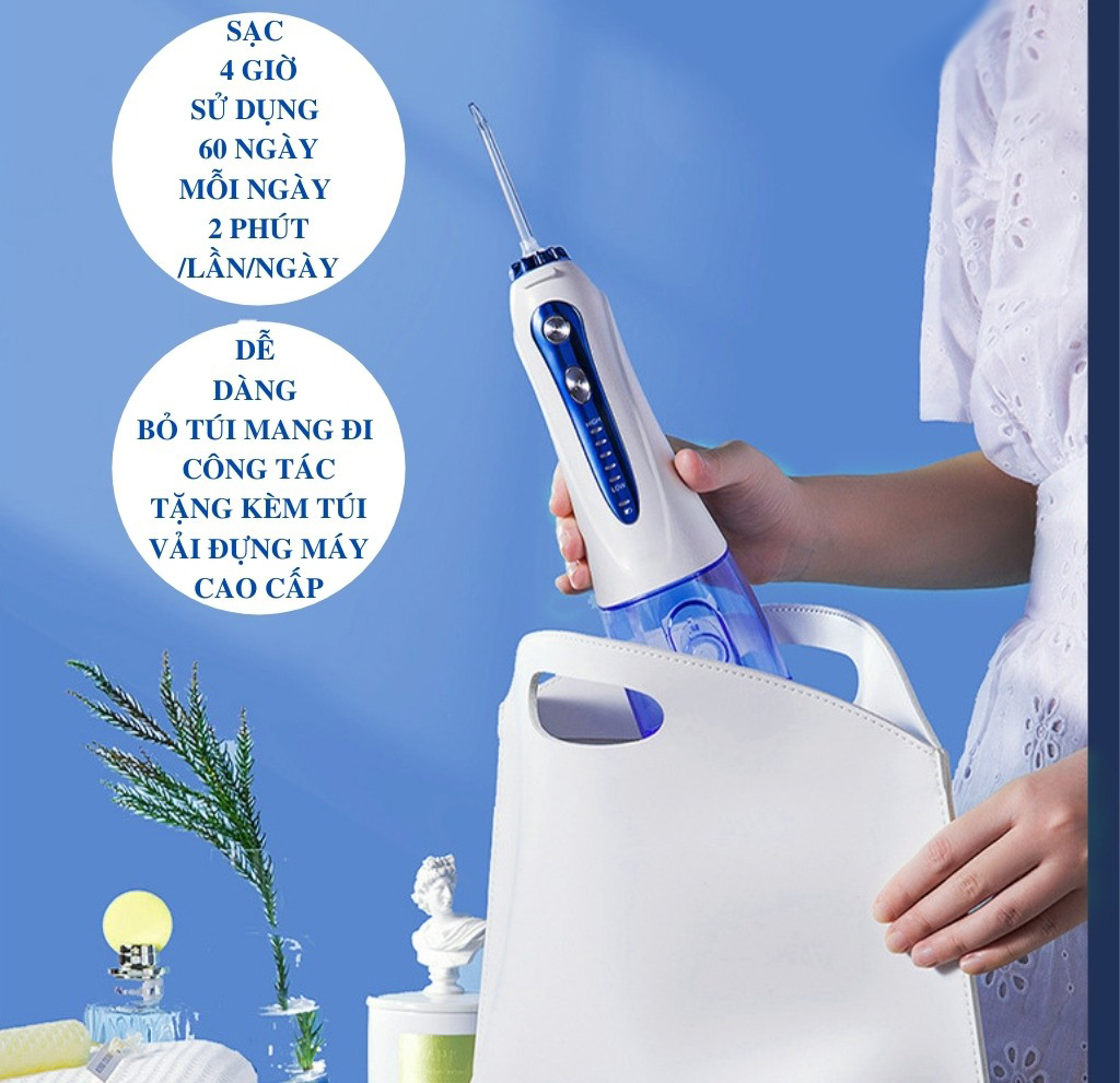 THÔNG SỐ SẢN PHẨM   Pin: 2500 mAh pin Lithium-ion, có thể sạc lại (sử dụng được 30 ngày, 2 phút/ lần/ ngày để tốt cho răng nướu, thời gian sử dụng sẽ phụ thuộc vào tần suất sử dụng và nguồn điện nạp vào của mỗi khách hàng) Chất liệu: Nhựa cao cấp ABS an toàn tuyệt đối đạt tiêu chuẩn FDA Màu sắc: Màu trắng Áp lực nước: 40-140PSI Công suất: 21W Nguồn điện đầu vào máy tăm nước: 5V - 1A, kết nối cáp sạc với củ sạc có nguồn điện tương thích. Tiêu chuẩn chống thấm nước IPX7 Bể nước: Tối đa 300 ml Sản phẩm lý tưởng để các bạn mang theo trong các chuyến du lịch Máy được cài đặt hẹn giờ 2 phút/ lần sử dụng, nếu muốn sử dụng thêm thao tác lại.   CÔNG DỤNG   Với công suất máy 21W gấp 4 lần phiên bản cũ, áp lực xung nước 1400 xung/nhịp, áp lực nước 40-140 psi giúp động cơ máy khoẻ hơn rất nhiều lần, đánh bật những mảng bám cứng đầu đem lại cho bạn hàm răng chắc khoẻ Cáp sạc đầu USB tiện lợi, có thể kết nối nguồn điện bằng củ sạc điện thoại, máy tính, ô tô, cổng sạc dự phòng,… Nút che sạc gắn liền cố định trên thân máy, ngăn chặn yếu tố bên ngoài xâm lấn Bình nước có thể tháo rời cực kì tiện lợi, giúp cho việc vệ sinh dễ dàng hơn 5 mức chế độ điều chỉnh từ thấp tới cao, dễ dàng lựa chọn chế độ phù hợp với bản thân Đầu tăm tròn xoay 360 độ giúp len lỏi đi vào tận kẽ răng, đẩy thức ăn thừa, cặn bẩn bám sâu trong khoang miệng Sản phẩm có 5 đầu xịt thay thế: 1 đầu chỉnh nha, 1 nha chu, 1 cạo lưỡi, 2 tiêu chuẩn. Sử dụng 5 đầu cho 1 người, đầu chỉnh nha dùng để vệ sinh mắc cài, bề mặt răng nên lực nước nhẹ hơn; đầu nha chu vệ sinh kẽ răng khi răng viêm lợi, nha chu, sâu răng, lực nước của đầu này cũng nhẹ nhàng hơn nên phù hợp với răng nhạy cảm và người mới sử dụng lần đầu; đầu cạo lưỡi vệ sinh lưỡi; đầu tiêu chuẩn vệ sinh khoang răng, kẽ răng và vùng thức ăn bám chặt với lực nước phun mạnh mẽ   BỘ ĐẦU XỊT BAO GỒM   2 đầu tăm cơ bản cho mọi nhu cầu, với áp lực nước mạnh nhất 1 đầu tăm niềng răng, hoạt động như bàn chải, vệ sinh mắc cài 1 đầu tăm nha chu với vòi nhọn làm sạch túi nha chi 1 đầu tăm vệ sinh lưỡi, làm sạch mảng bám Túi đựng máy   HƯỚNG DẪN SỬ DỤNG   Cho tia nước dừng lại ở từng kẽ răng tối thiểu 2 giây. Giữ cho bình nước khô ráo sau khi sử dụng để tránh ẩm mốc. Chống nước IPX7, hoàn toàn có thể cọ rửa, lau chùi bằng nước. Nên thay mới đầu phun tối thiểu 3 tháng 1 lần. Có thể sử dụng kèm nước ấm để tốt hơn cho nướu     Sản phẩm được phân phối chính hãng tại Công ty Phương Linh với dịch vụ chăm sóc khách hàng và bảo hành sản phẩm tốt nhất. Bảo hành Bảo hành chính hãng 12 tháng Bảo hành 1 đổi 1 (Đối với lỗi từ nhà sản xuất) Bảo hành thông qua mã đơn mua hàng trên sàn Tiki, không cần hóa đơn. Tất cả sản phẩm công ty phân phối đều bảo hành qua mã đơn hàng, khách hàng ở tỉnh nếu không đến trực tiếp có thể gửi qua đường bưu điện, bên công ty sẽ gửi hàng bảo hành tận nơi cho các bạn. Trung tâm bảo hành: Phường An Phú, Quận 2, HCM. Điều kiện bảo hành: Vui lòng giữ lại HỘP của sản phẩm và khi cần bảo hành vui lòng chat với Shop qua app Tiki.  Hỗ trợ khách hàng Hỗ trợ tư vấn qua khung chat với Shop trên app Tiki Thời gian làm việc: 8h - 12h00 và 13h30 - 17h00 (Từ thứ 2 đến thứ 6, trừ các ngày Lễ/Tết).  Vui lòng QUAY VIDEO khui gói hàng trước khi mở gói hàng để đảm bảo SHOP giao đúng và đủ đơn hàng. Cảm ơn quý khách đã ủng hộ!