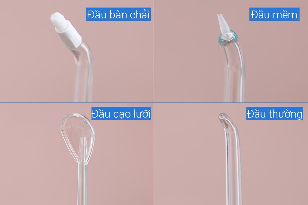 • Đầu dành cho vùng nha chu: thiết kế đặc biệt để dùng cho vùng nha chu, chỉ dùng ở tốc độ thấp, đặt đầu tăm vào răng góc 45 độ, đẩy nhẹ đầu tăm vào từng kẽ răng để làm sạch hiệu quả.