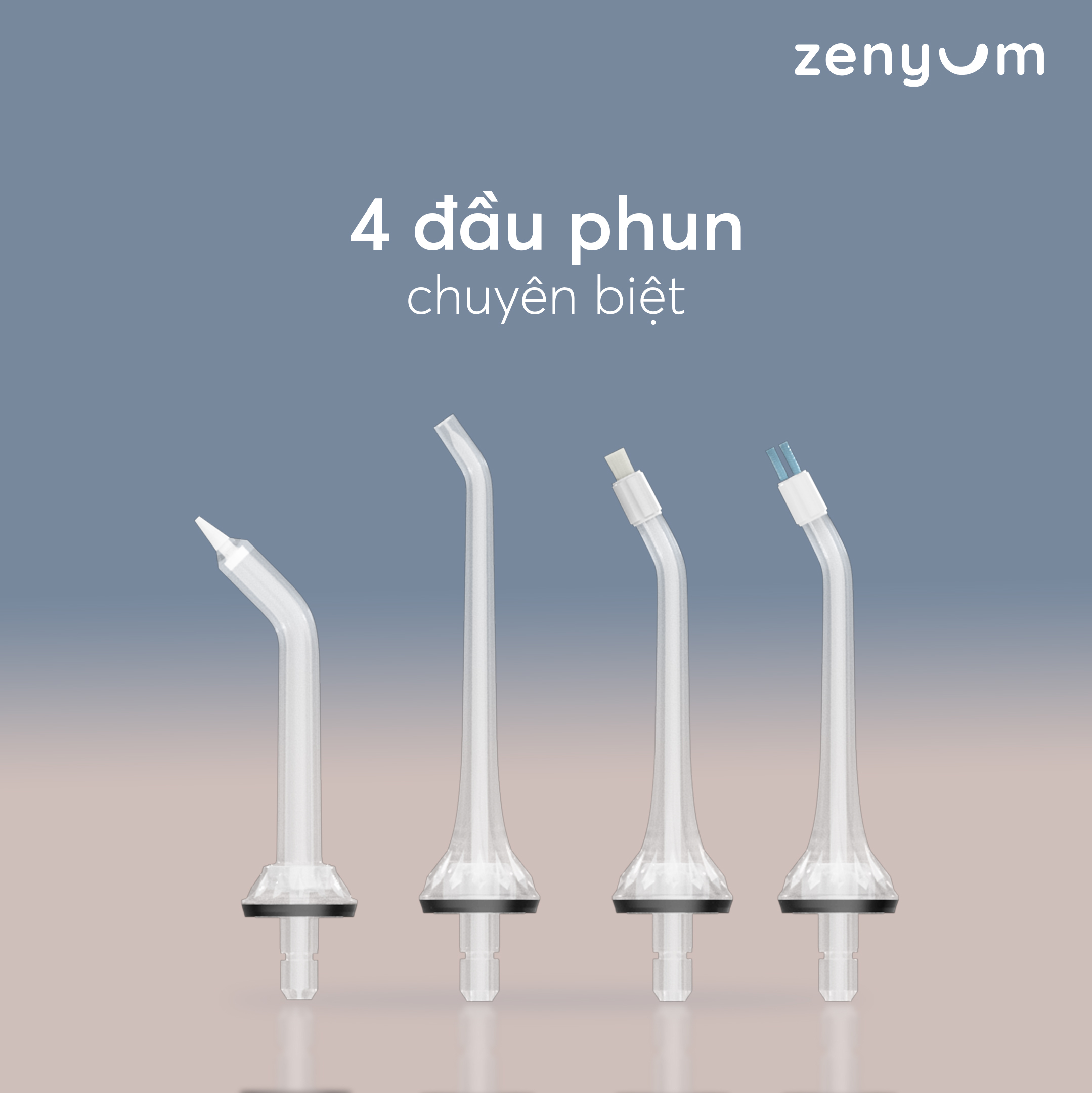Máy tăm nước Zenyum Pro (Trắng/ Đen/Hồng)   Sử dụng công nghệ xung động nước tần số cao, tăm nước Zenyum Pro giúp làm sạch thức ăn, mảng bám trong kẽ răng, túi nha chu, là những vị trí mà bàn chải không chạm đến được.    BỘ SẢN PHẨM GỒM: > 1 Thân máy tăm nước Zenyum Pro > 4 đầu phun chuyên dụng > 1 phiếu hướng dẫn sử dụng > 1 cáp sạc USB   TÍNH NĂNG:  > Công nghệ xung động nước tần số cao (1400 - 1800 lần/phút). Giúp làm sạch hiệu quả thức ăn, mảng bám trong từng kẽ răng > Khả năng tuỳ chỉnh áp lực làm sạch theo nhu cầu cá nhân > Màn hình OLED cùng 5 chế độ làm sạch, đáp ứng mọi nhu cầu của bạn. Đặc biệt chế độ DIY cho phép tuỳ chỉnh áp lực nước theo nhu cầu của riêng bạn, rất phù hợp cho các bạn có tình trạng răng miệng nhạy cảm.  > Đa năng và linh hoạt với 4 đầu phun chuyên biệt có thể điều chỉnh xoay 360 độ giúp tia nước có thể chạm đến mọi ngóc ngách trong khoang miệng. > Thời lượng pin đến 30 ngày cho 1 lần sạc. > Chống nước IPX7 > Dung tích bình nước đến 280ml, hạn chế phải thêm nước trong quá trình sử dụng. > Bảo hành chính hãng 1 năm.      CÁCH SỬ DỤNG:  > Lắp vòi phun mong muốn của bạn vào thân máy cho đến khi nghe tiếng tạch. > Mở nắp bình chứa và đổ đầy nước. Lưu ý chỉ đổ nước khi máy đang được tắt. Nhấn nút Nguồn để mở máy. > Nhấn nút điều chỉnh chế độ để chọn chế độ mong muốn. Nhấn nhiều lần để đổi qua các mức độ Nhẹ - Trung Bình - Mạnh và chế độ DIY tuỳ chỉnh. > Điều chỉnh hướng của tia nước bằng cách xoay đầu phun. > Giữ máy thẳng đứng để đảm bảo dòng nước chảy dễ dàng từ bình chứa  ** MÁCH BẠN: Để làm sạch tốt nhất, hãy bắt đầu với mặt trong của răng sau đó đến mặt ngoài răng. Di chuyển đầu phun theo đường chân nướu và dừng lại một chút ở từng kẽ răng. Tiếp tục cho đến khi làm sạch cả mặt trong, mặt ngoài, hàm trên và hàm dưới.    CHĂM SÓC KHÁCH HÀNG: Nếu gặp bất cứ vấn đề gì cần hỗ trợ hãy inbox cho gian hàng của Shop ngay nhé!
